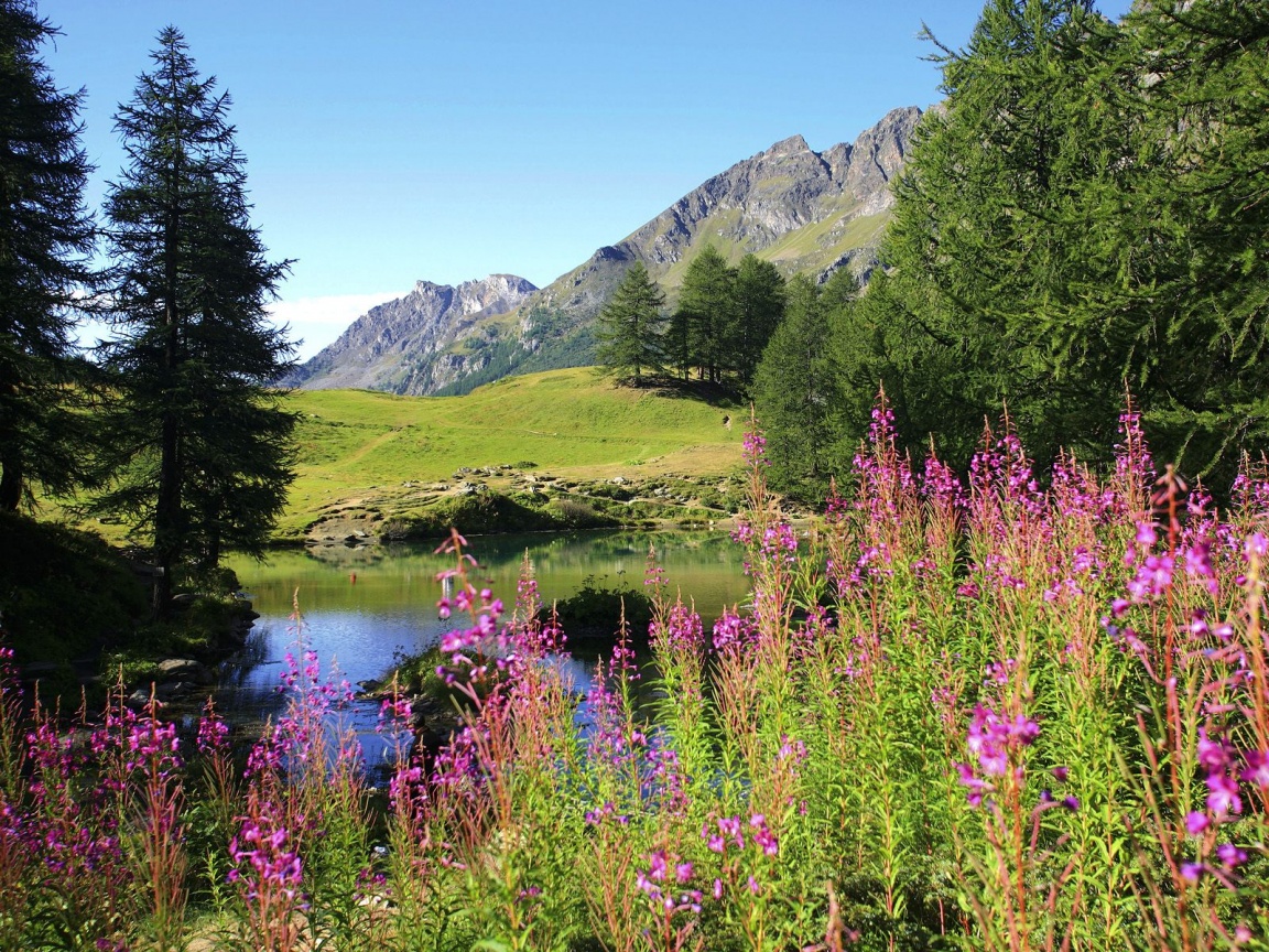 Description: A lake surrounded by trees and flowers in the mountainside area of a valley with a mountain range in the background.