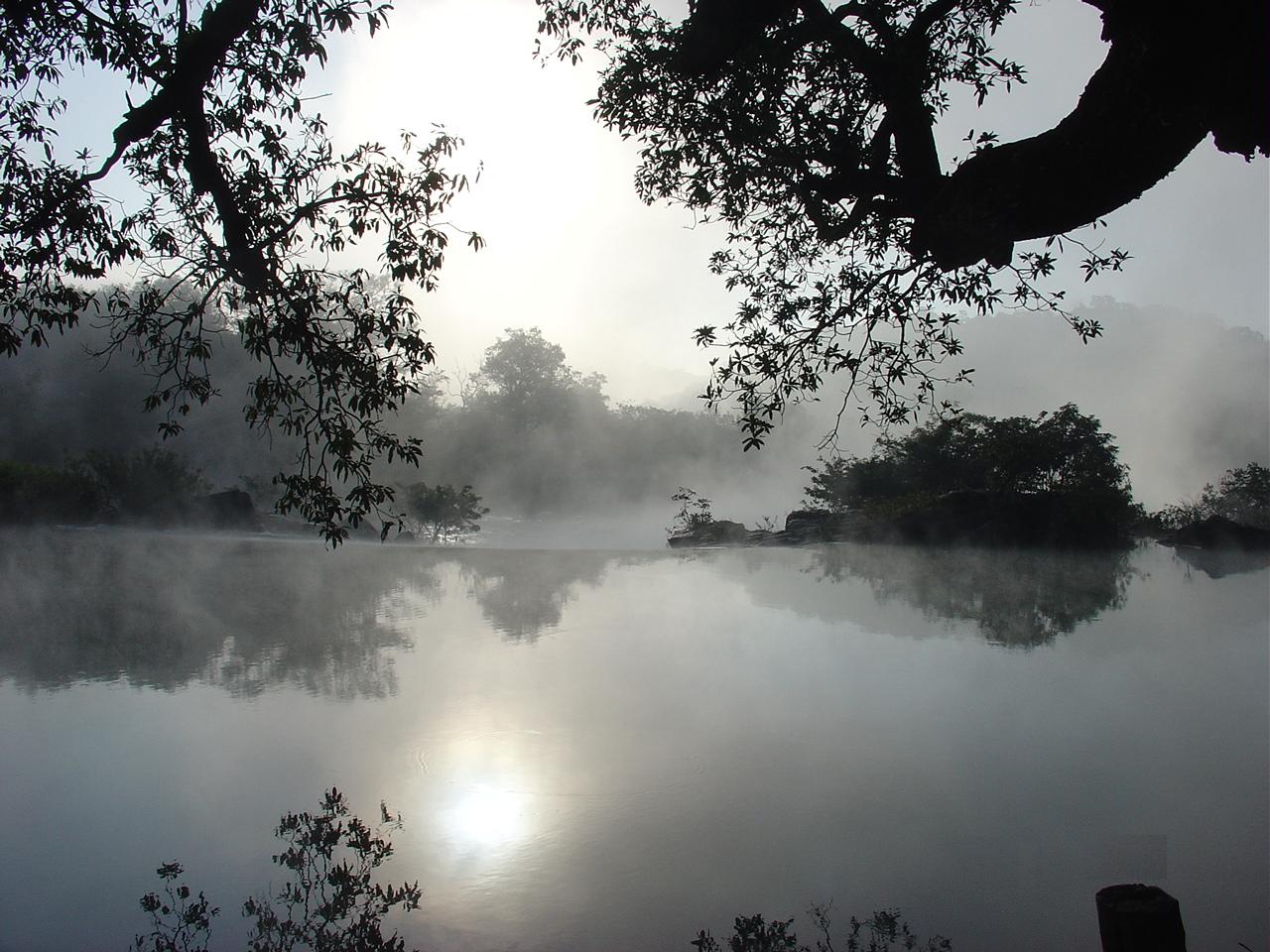 Description: A lake with a few trees in the foreground and a foggy sky in the background with a few clouds.