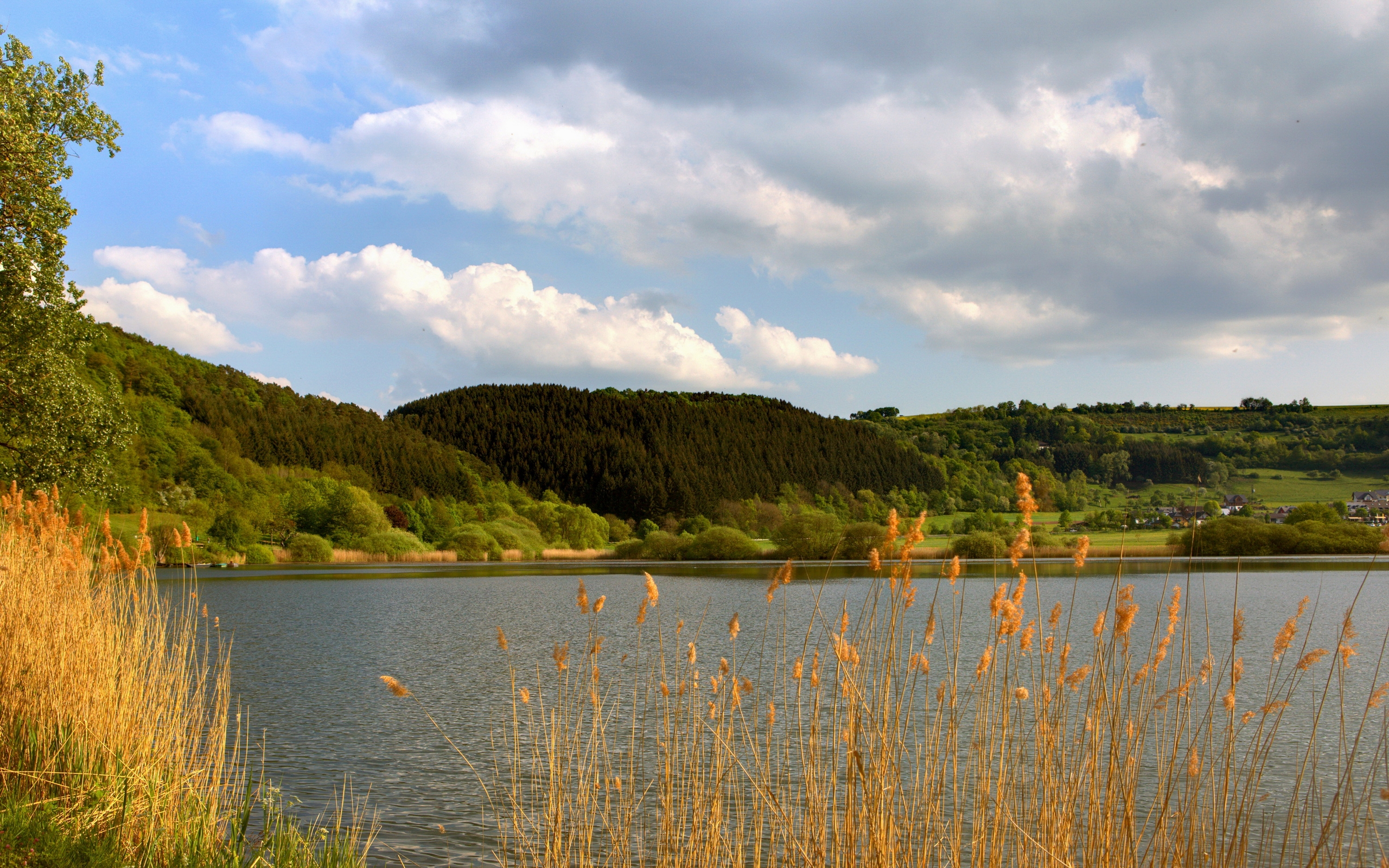 Description: A lake surrounded by tall grass and trees with a cloudy sky above it and a hill in the distance.