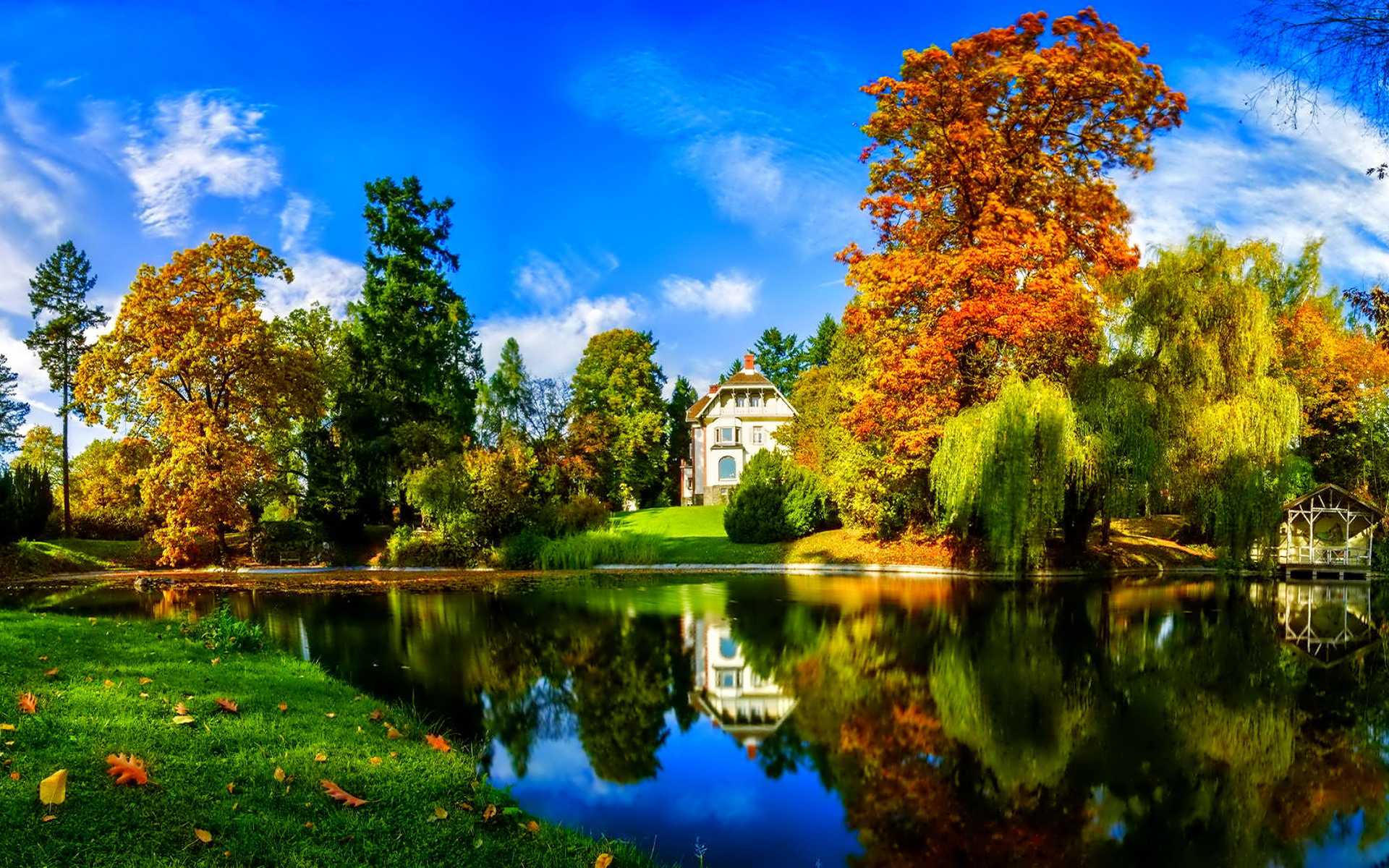 Description: A lake surrounded by trees with a house in the background and a blue sky with clouds in the background.