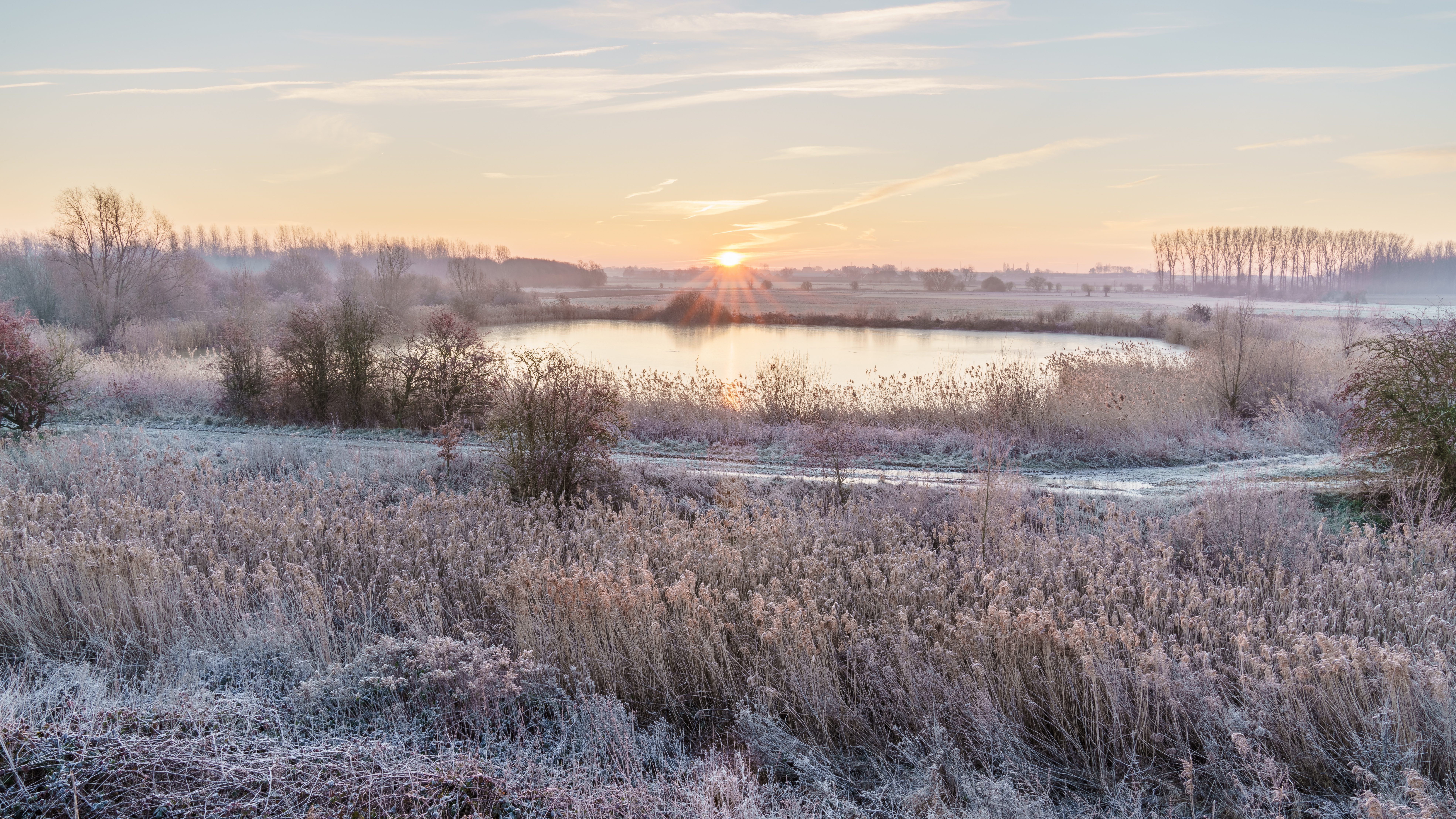 Description: A lake surrounded by tall grass and trees with a sunset in the background and a few clouds in the sky.
