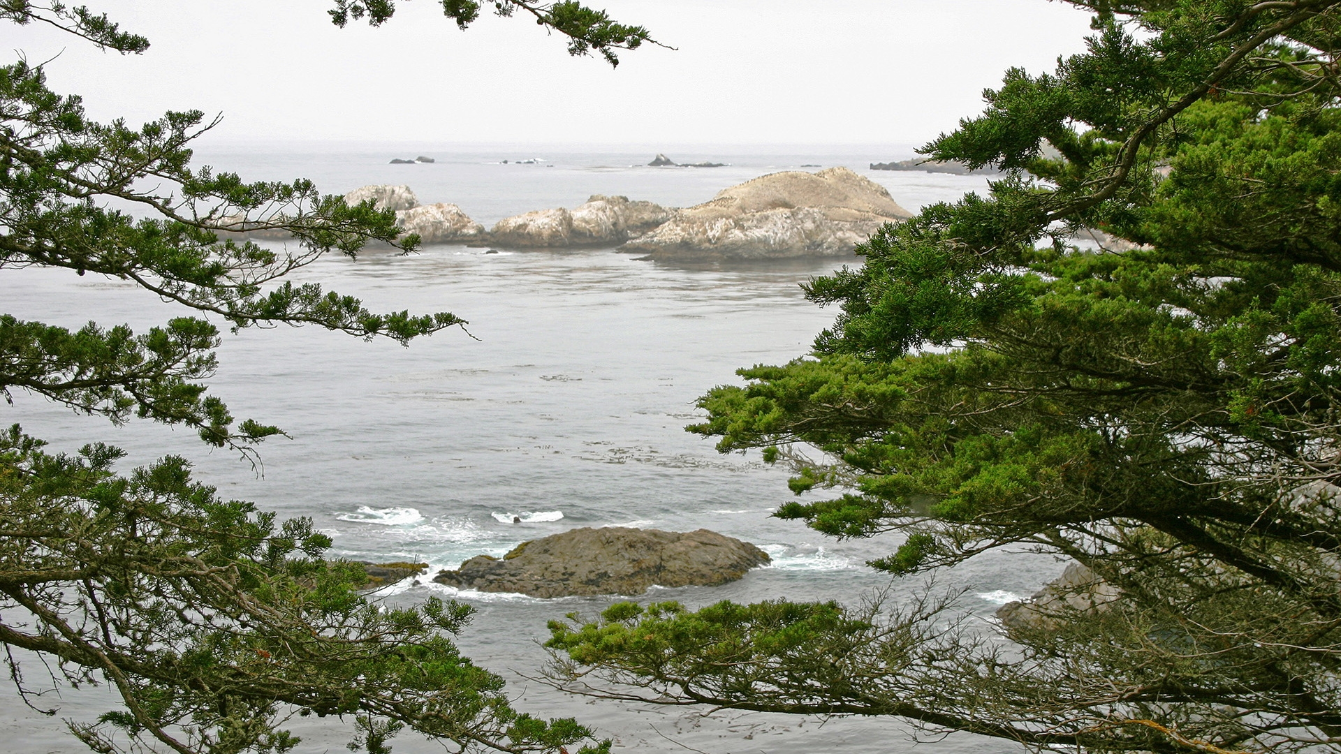 Description: A view of a body of water from a hill near a tree line with rocks in the background and a few trees in the foreground.