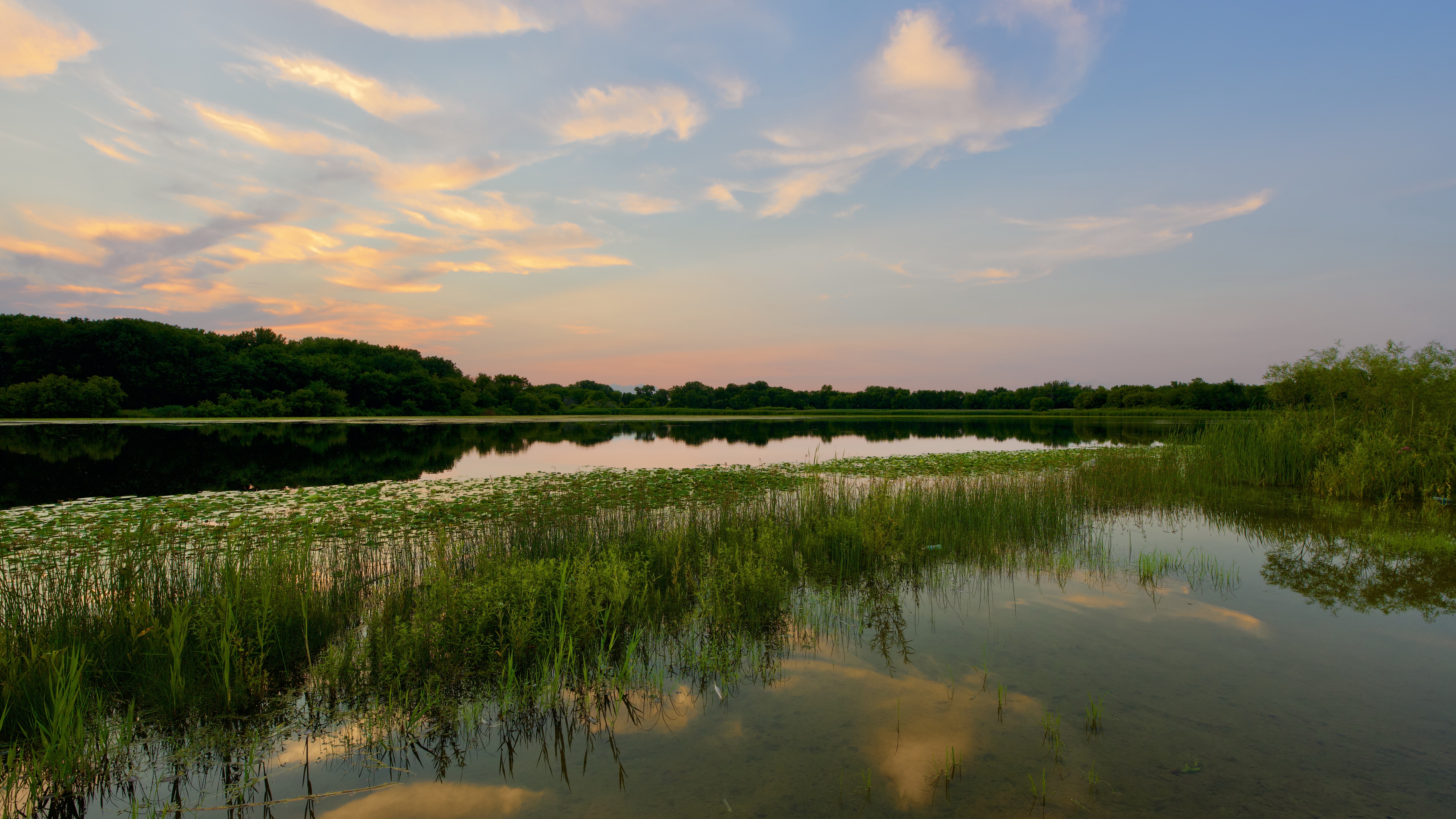 Description: A lake with a bunch of water plants in it and a sky with clouds above it and a few clouds in the sky.