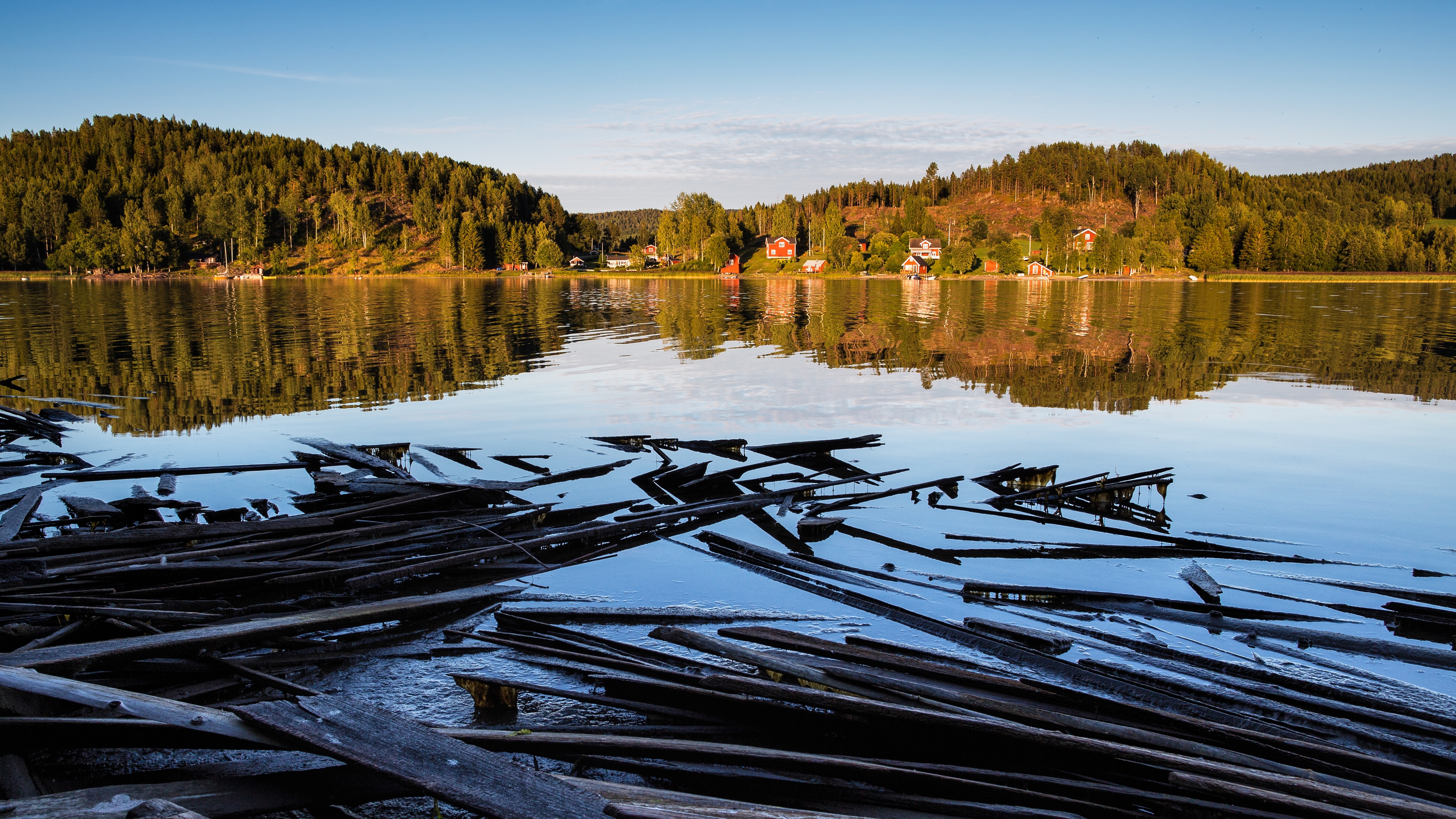 Description: A lake with a bunch of sticks in the water and trees in the background and a house on the shore.