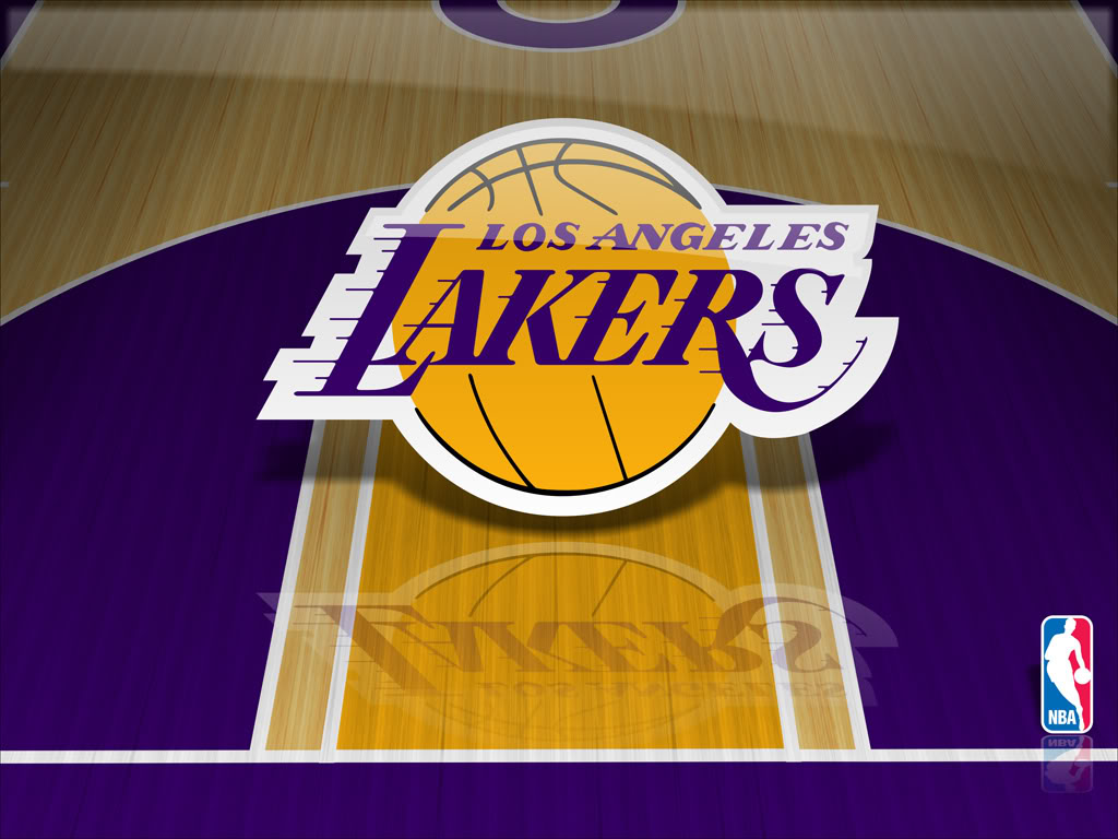 Description: A los lakers logo on a court with a basketball in the middle of it and a basketball in the middle of the court.