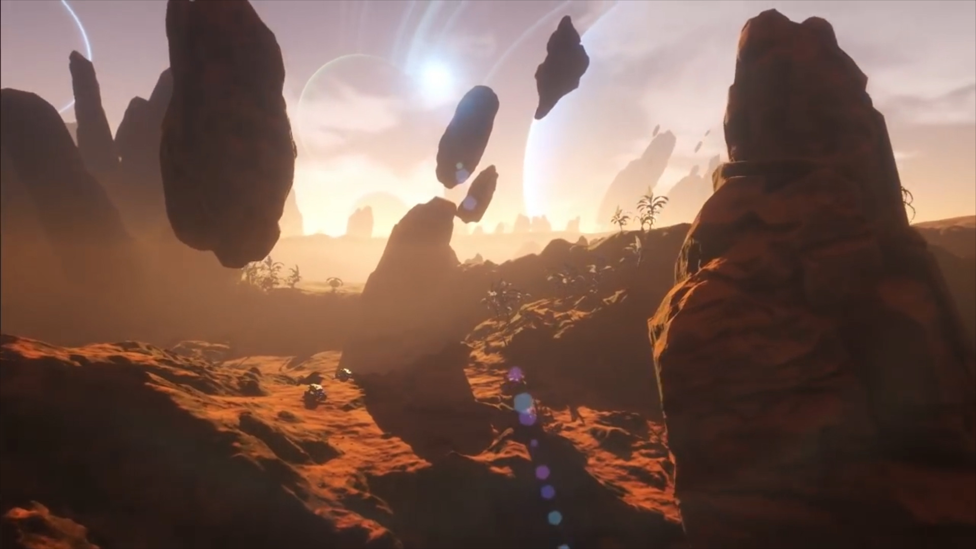 Description: A computer generated image of a landscape with rocks and plants in the foreground and a bright sun in the background.