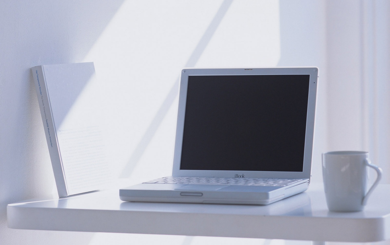 Description: A laptop computer sitting on top of a white desk next to a cup of coffee and a book on a white shelf.