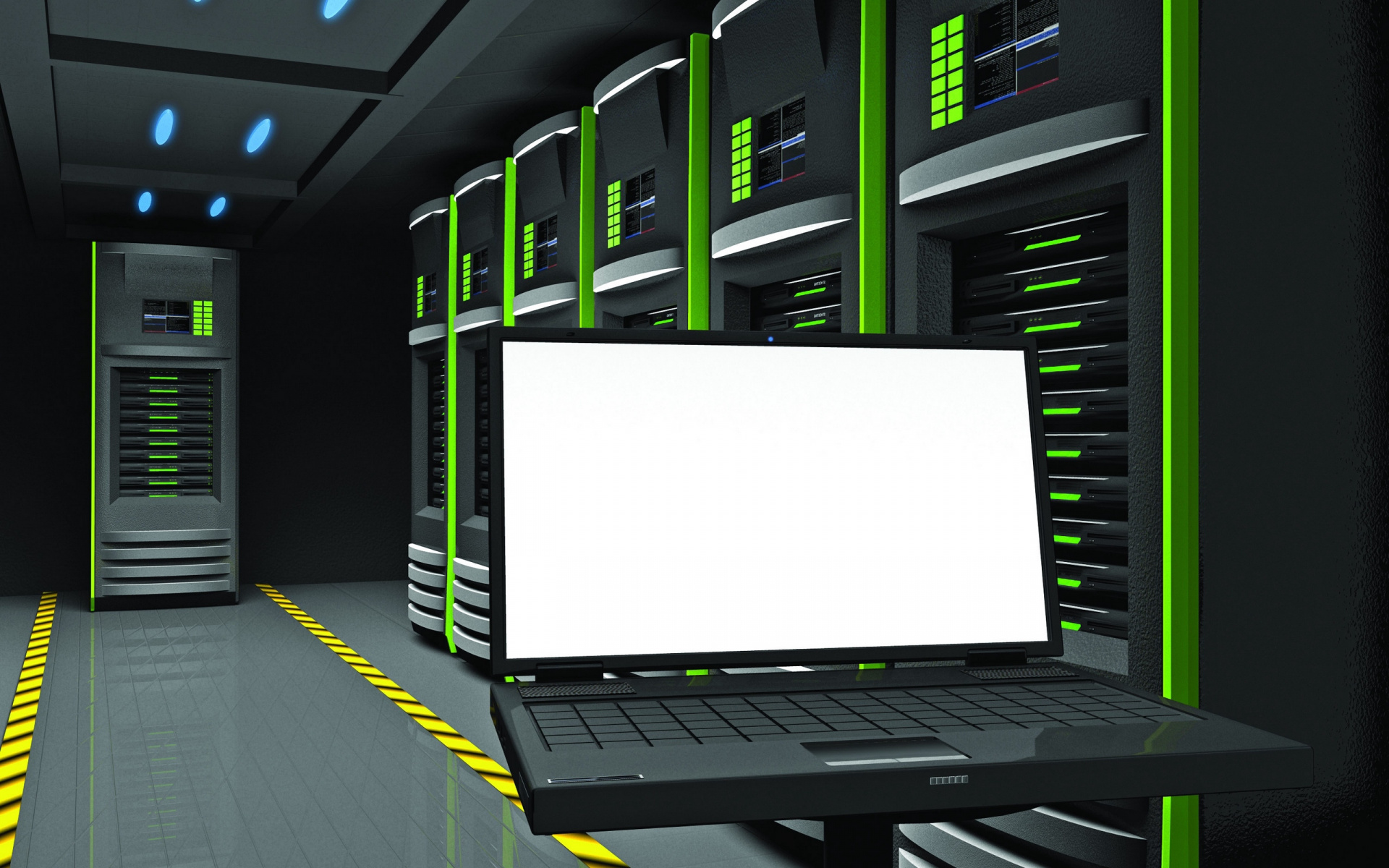 Description: A laptop computer sitting on a shelf in a server room with a blank screen on it's side.