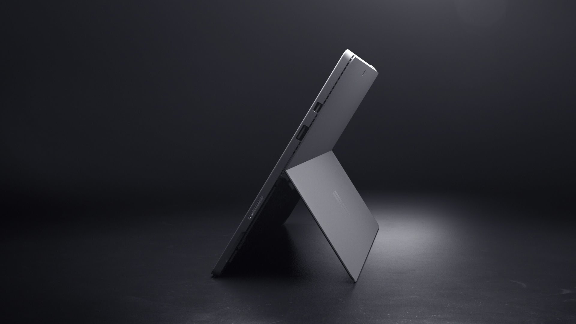 Description: A laptop computer sitting on top of a table in the dark room with a light shining on it's side.