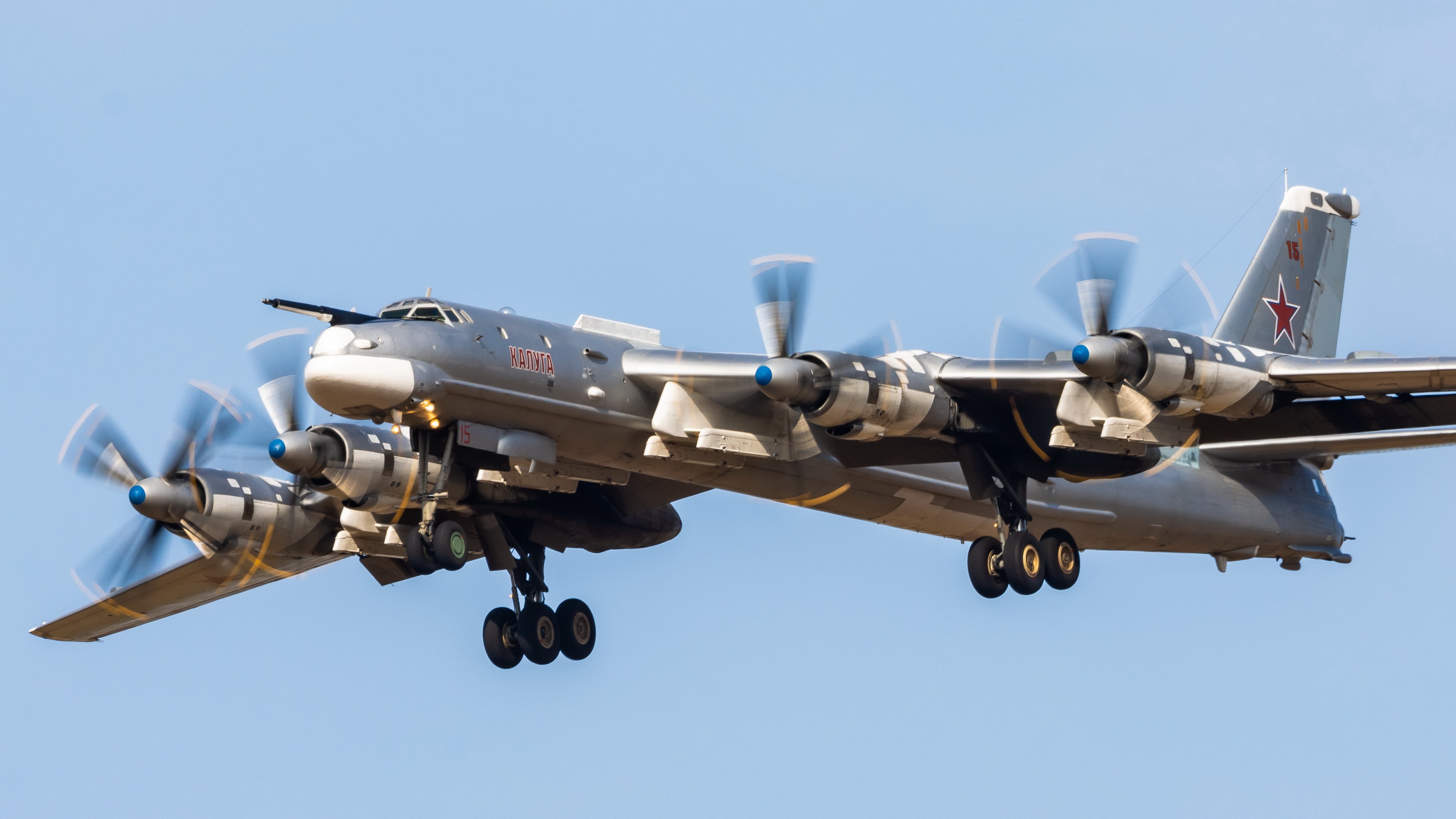 Description: A large airplane flying through a blue sky with propellers on it's wings and wheels down the side.