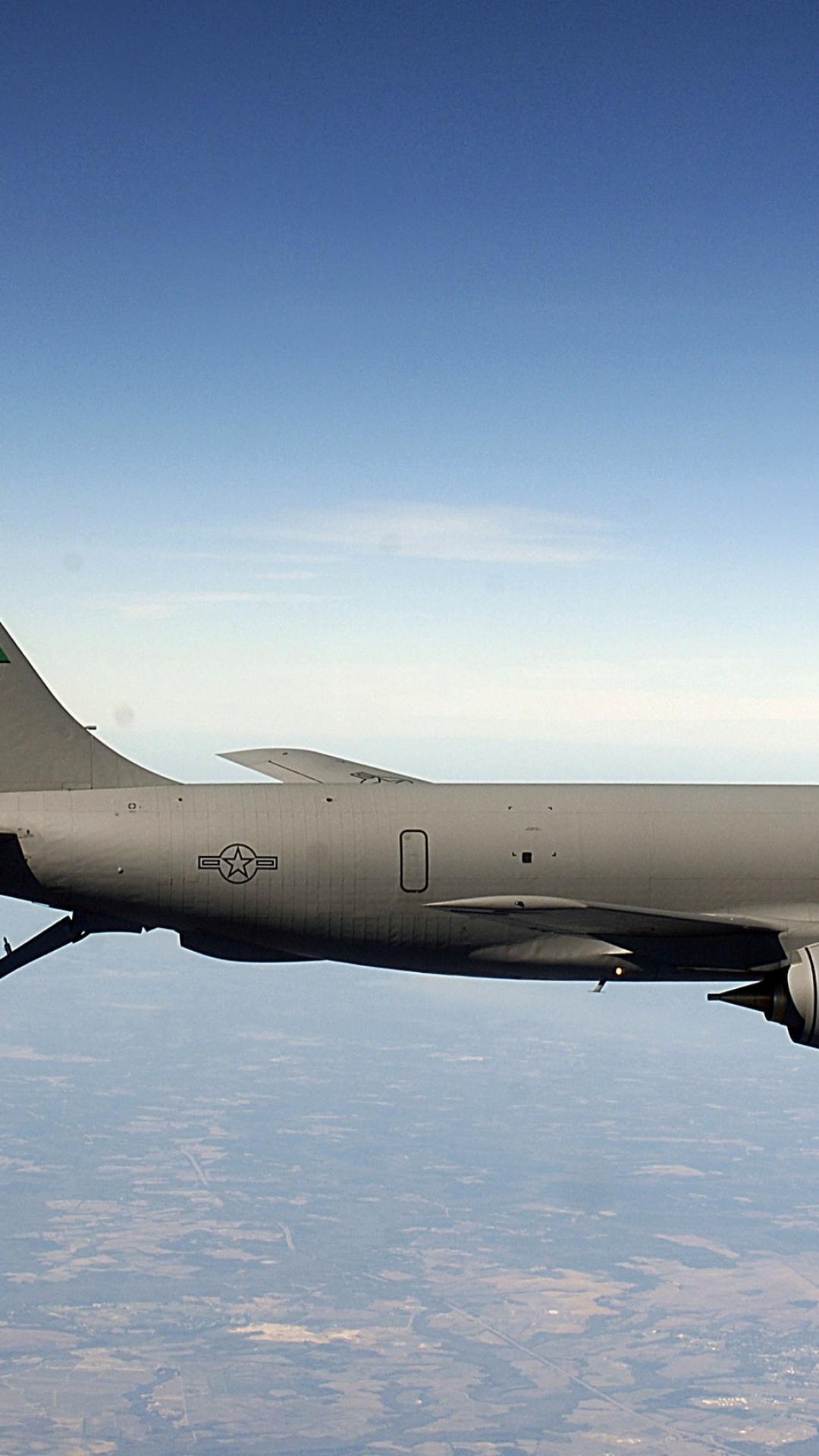 Description: A large air plane flying through a blue sky above the ground and land below it is a plane with a propeller.