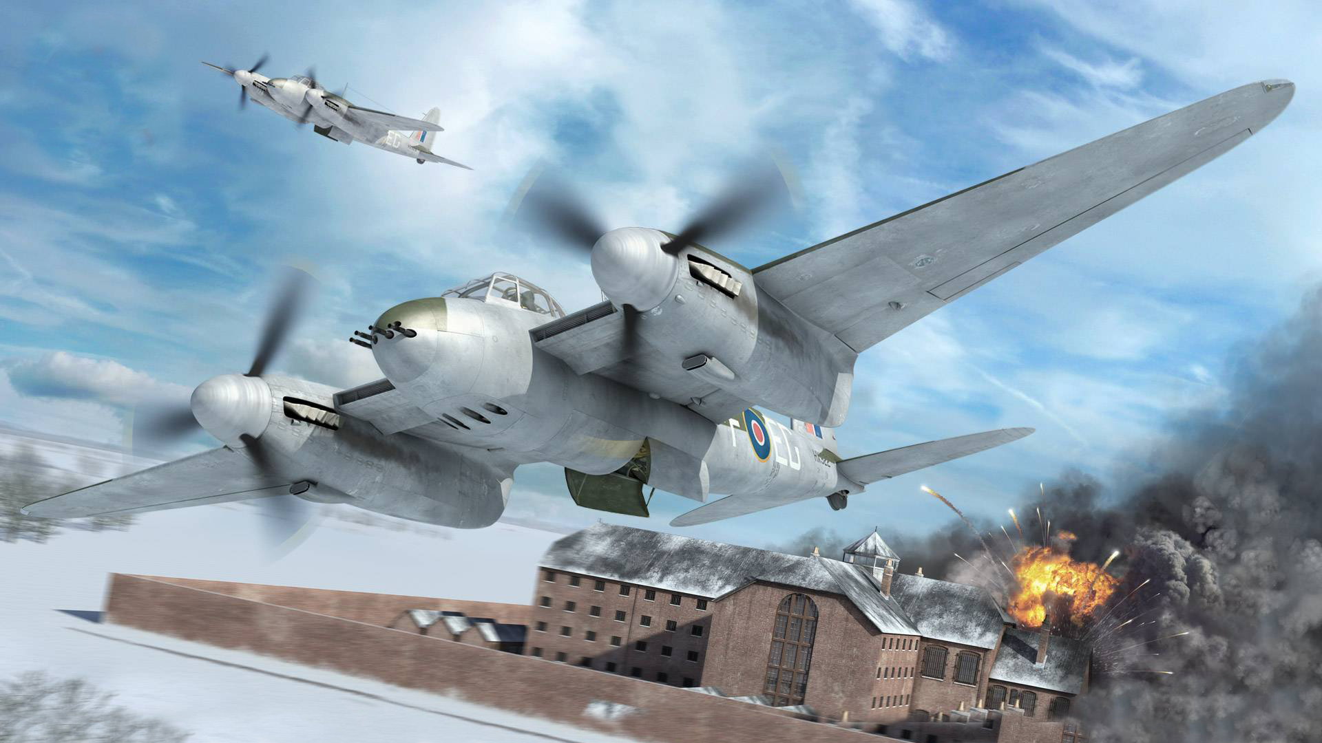 Description: A large air plane flying over a building on a snowy day with two planes flying over it and a building on fire.