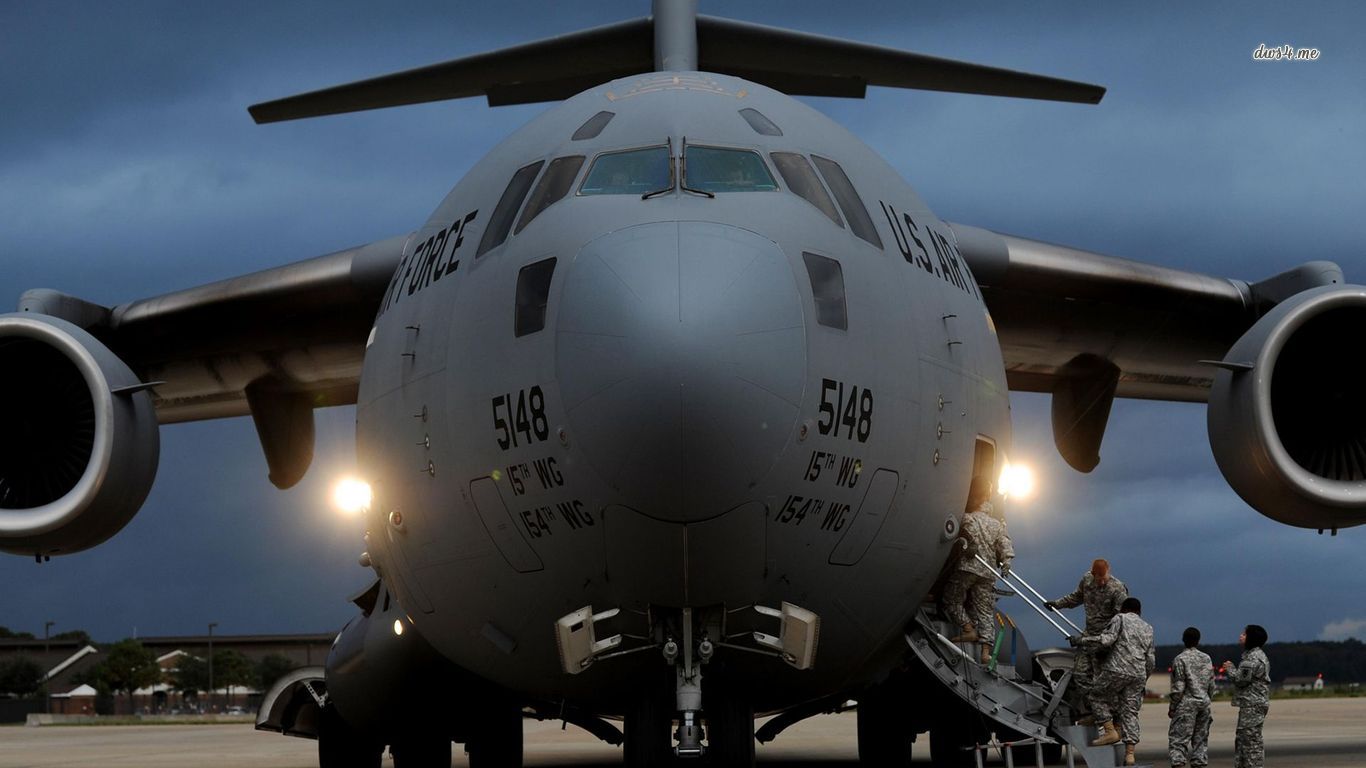 Description: A large airplane with a bunch of people standing around it on the tarmac at night time with the lights on.