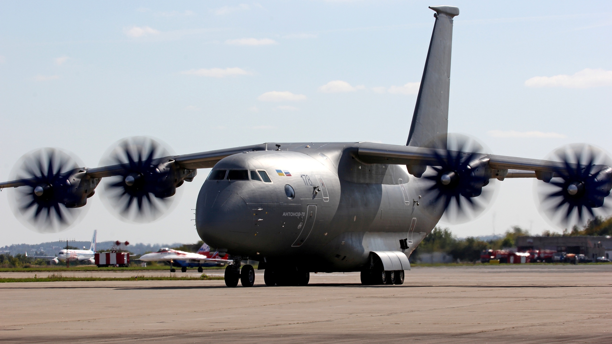 Description: A large airplane is on the runway with propellers on it's wings and a propeller on the side of the plane.