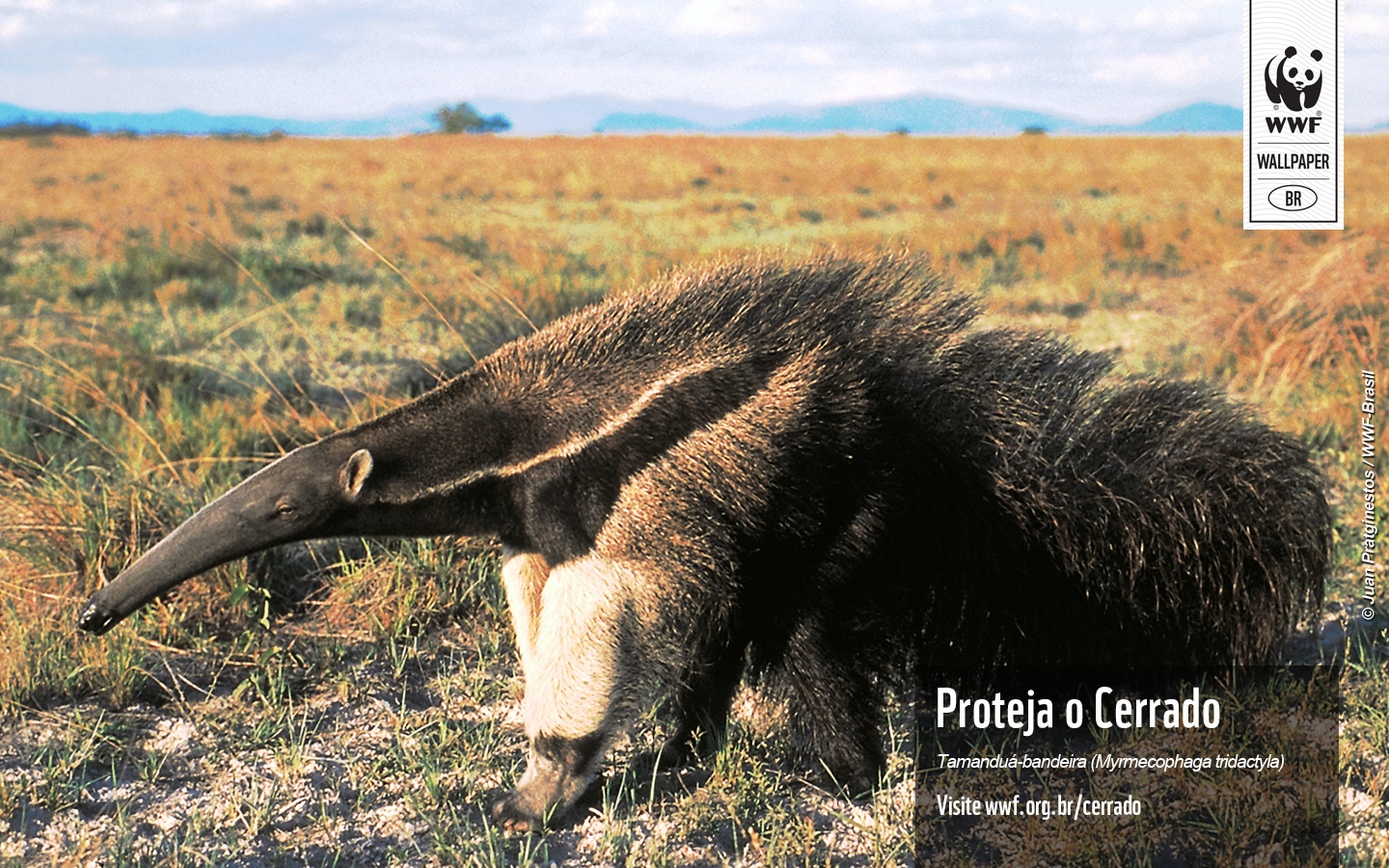 Description: A large animal walking through a grass covered field with a sky background and a panda bear logo on the front of the picture.