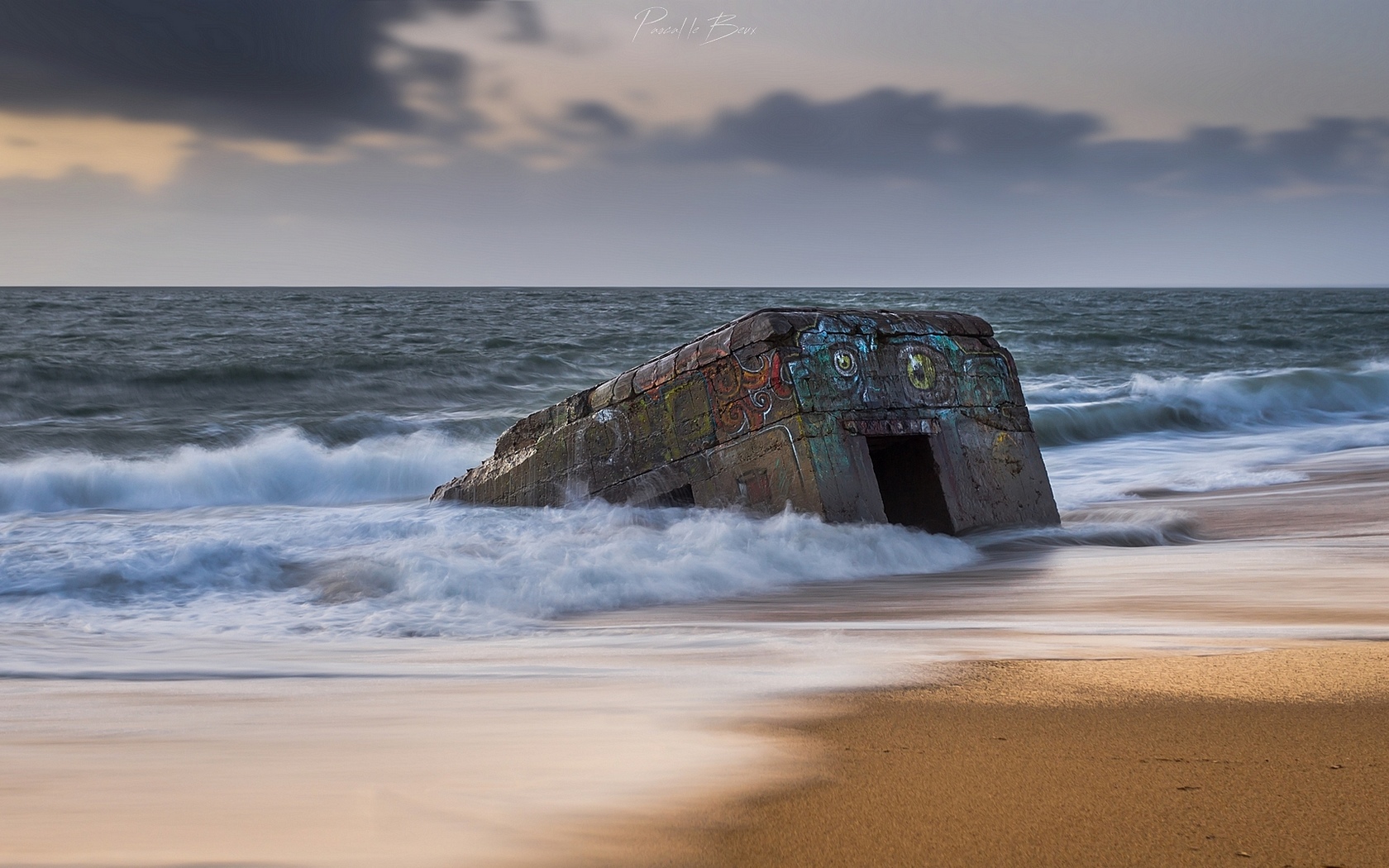 Description: A large piece of art sitting on top of a sandy beach next to the ocean with waves coming in.