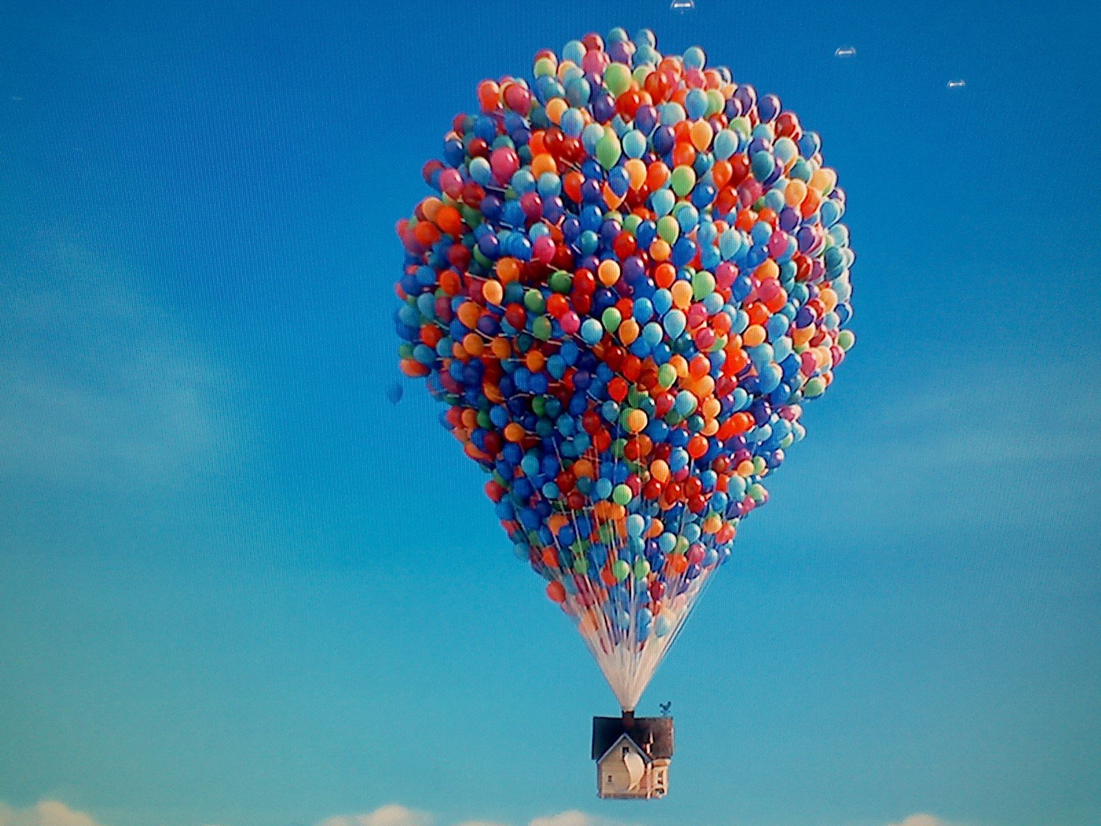 Description: A large balloon is being flown in the sky with a house on it's back end and a house on the other side.