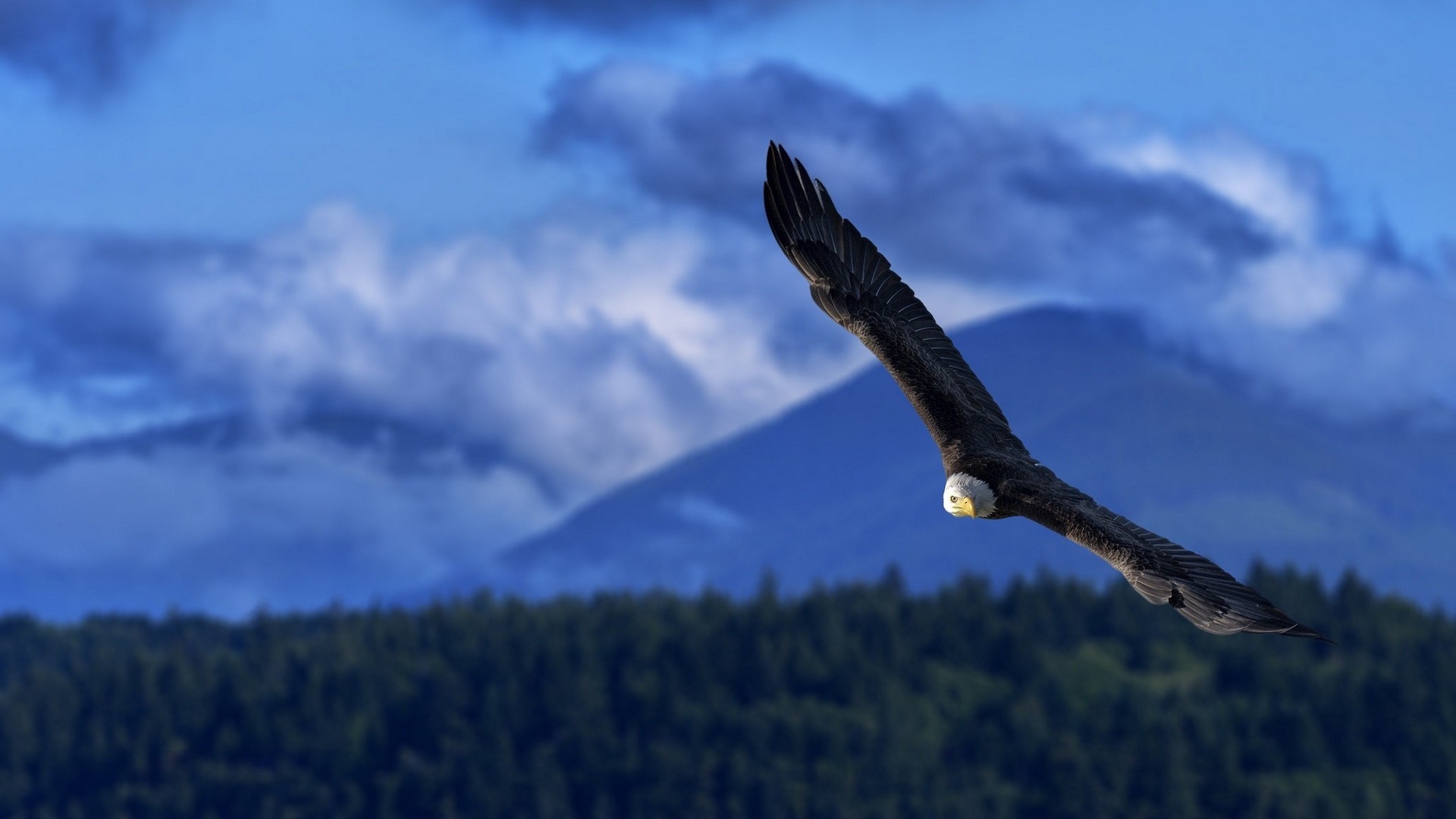 Description: A large bird flying over a forest under a cloudy sky with a mountain in the background with clouds in the sky.