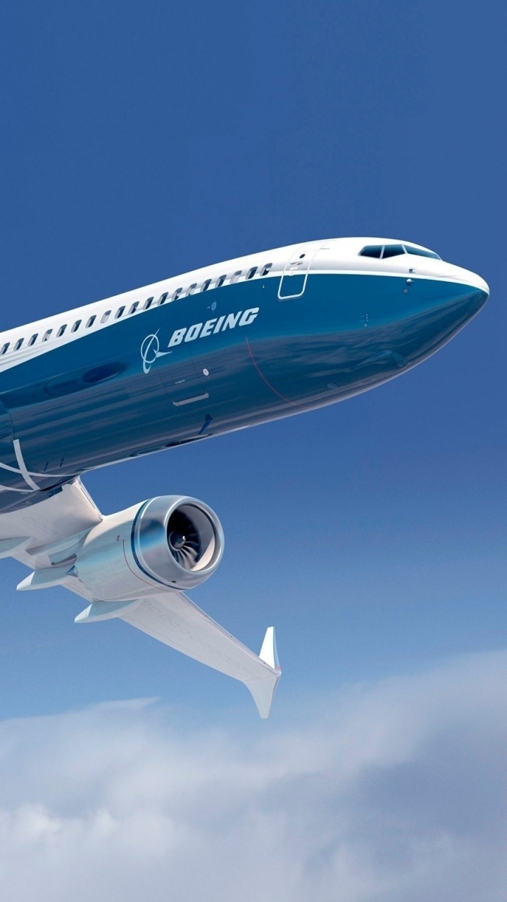 Description: A large blue and white airplane flying in the sky with clouds below it and a blue sky with white clouds.