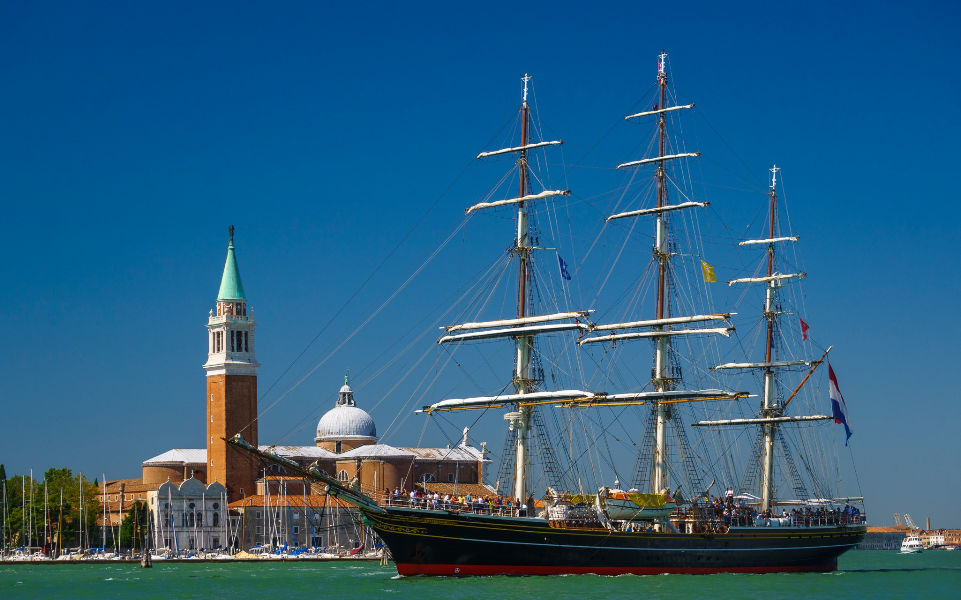 Description: A large boat sailing in the water near a building with a clock tower in the background and a clock tower in the foreground.