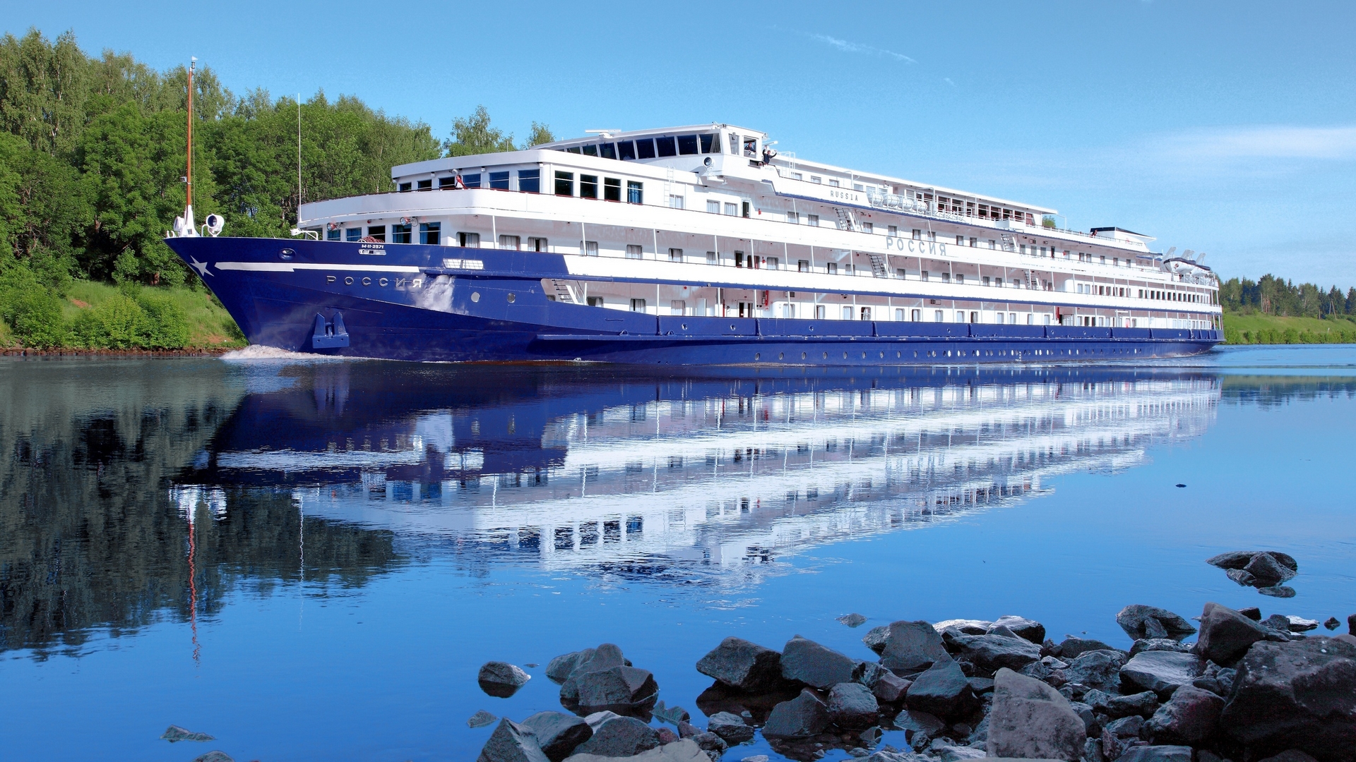 Description: A large boat is docked on the water near rocks and trees in the background.