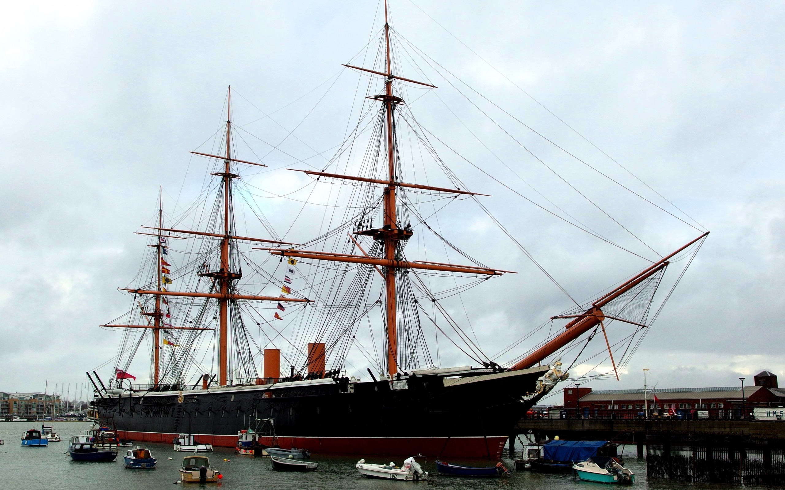 Description: A large boat is docked at a pier in the water with other boats around it and a dock with several boats.