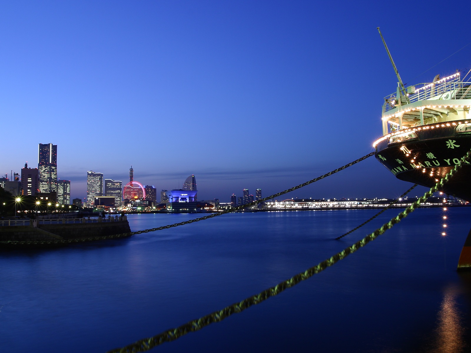 Description: A large boat is docked in the water near a city at night time with lights on it's side.