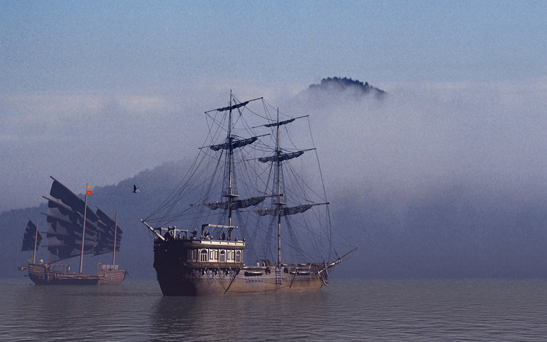 Description: A large boat sailing in the ocean with a smaller boat in the background with a mountain in the distance.