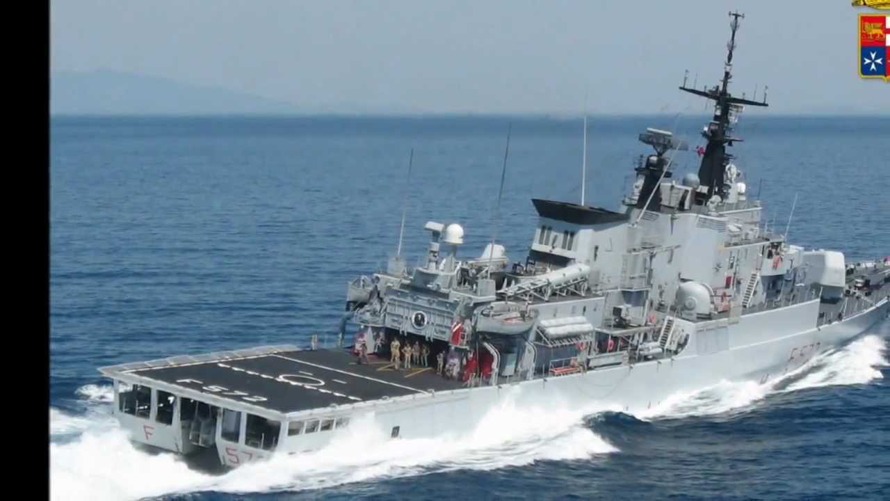 Description: A large boat in the middle of the ocean with a lot of people on it's deck and a flag on the side.