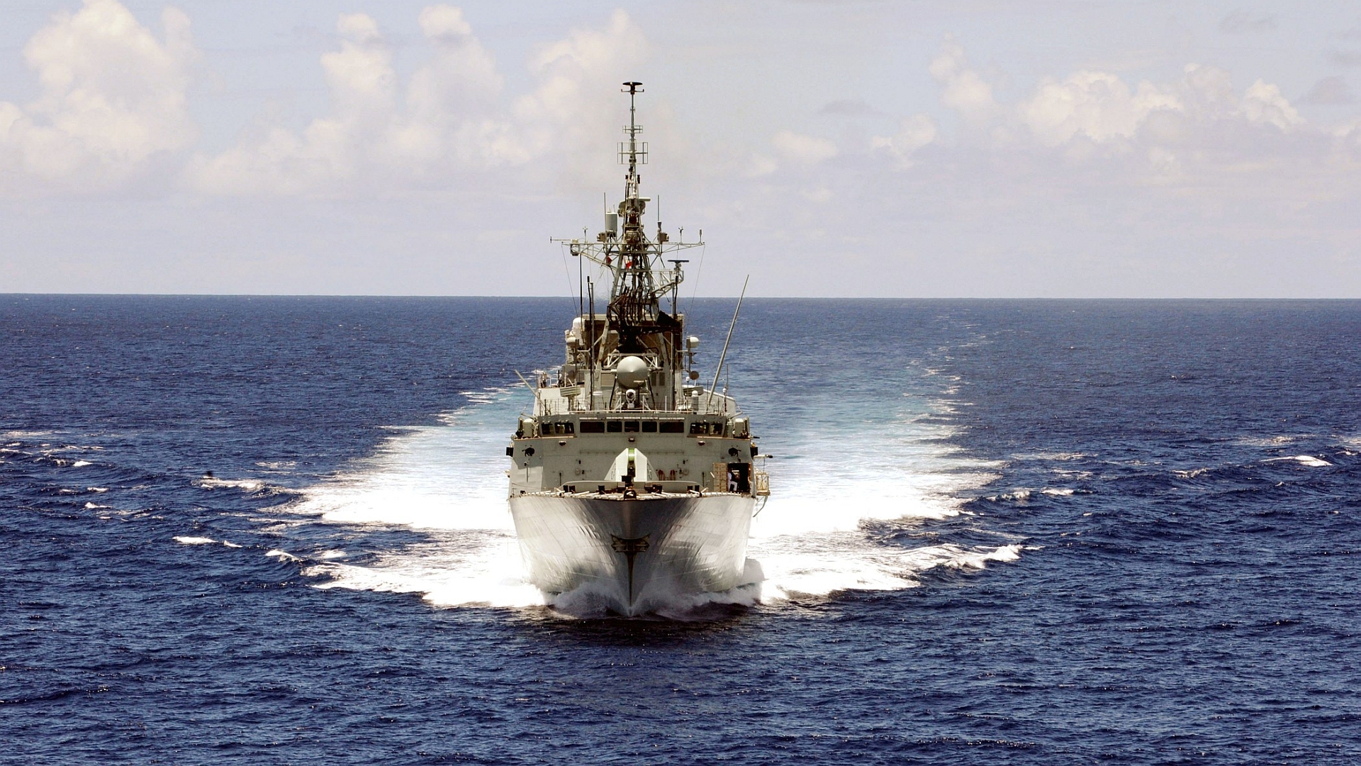 Description: A large boat is in the middle of the ocean water with a sky background and clouds in the sky.