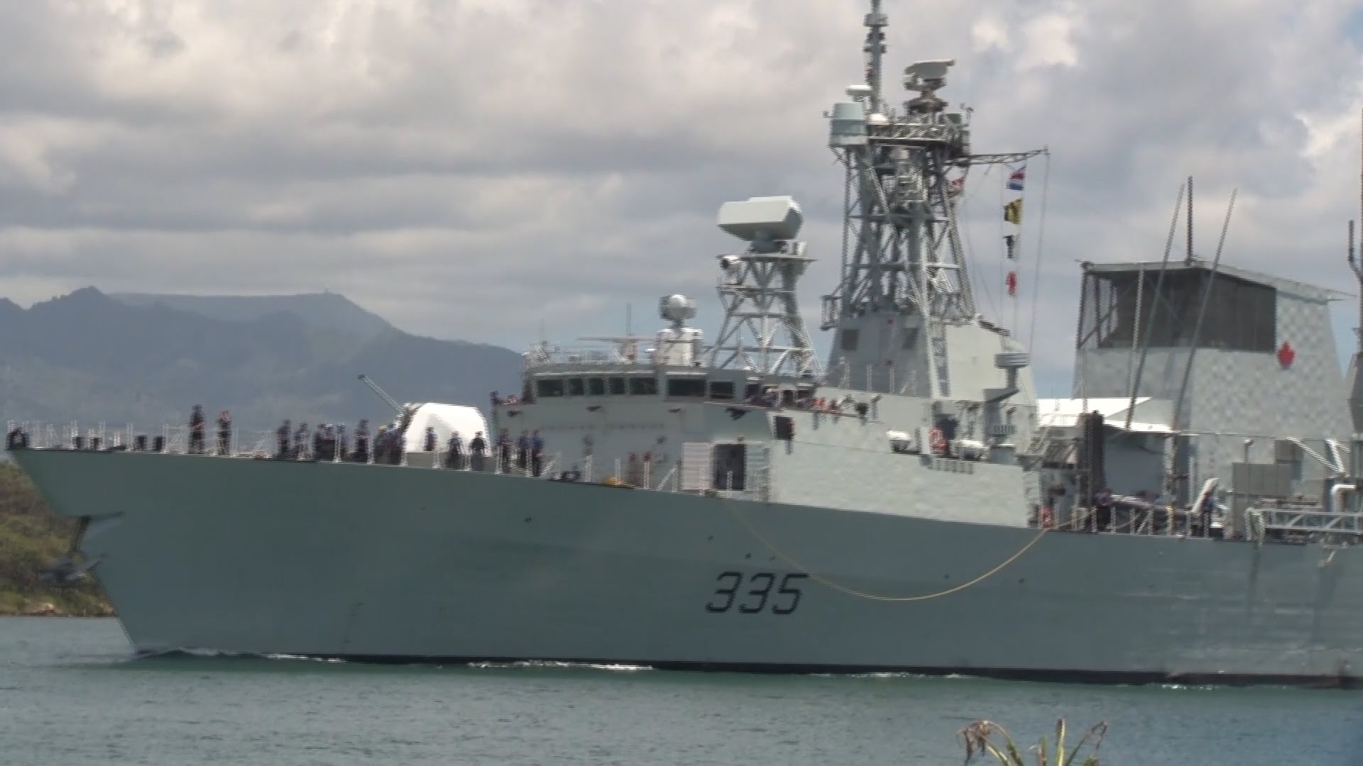 Description: A large boat with a lot of people on it in the water near a mountain range and a cloudy sky.