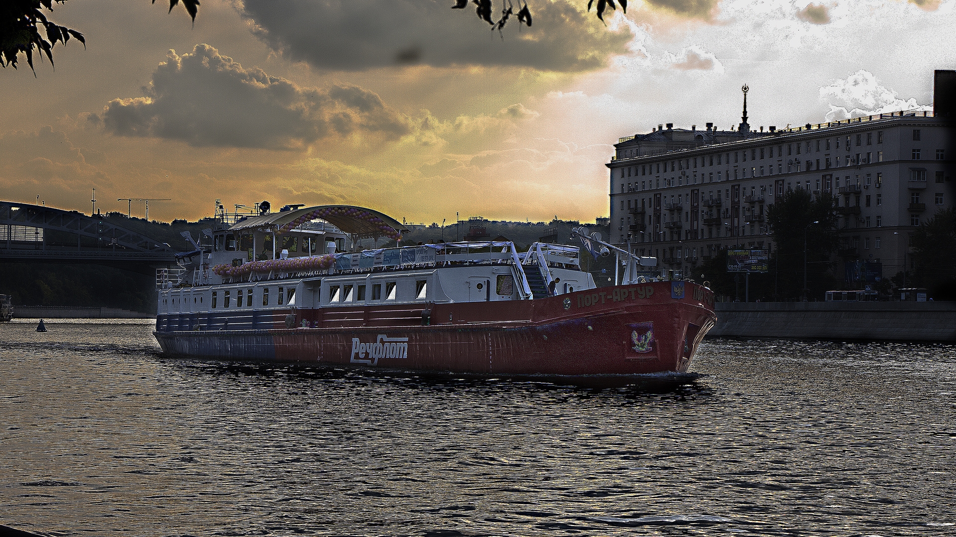 Description: A large boat floating on top of a river next to a tall building with a clock tower on top.