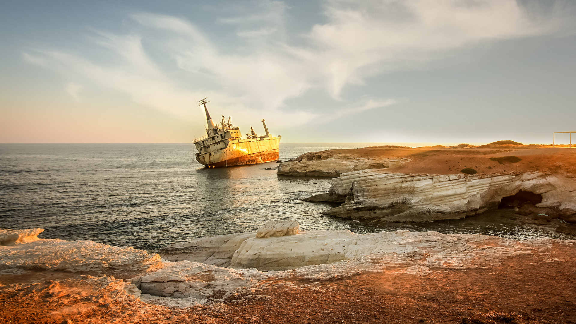 Description: A large boat is out on the water near a rocky shore with a cliff in the background and a few clouds in the sky.