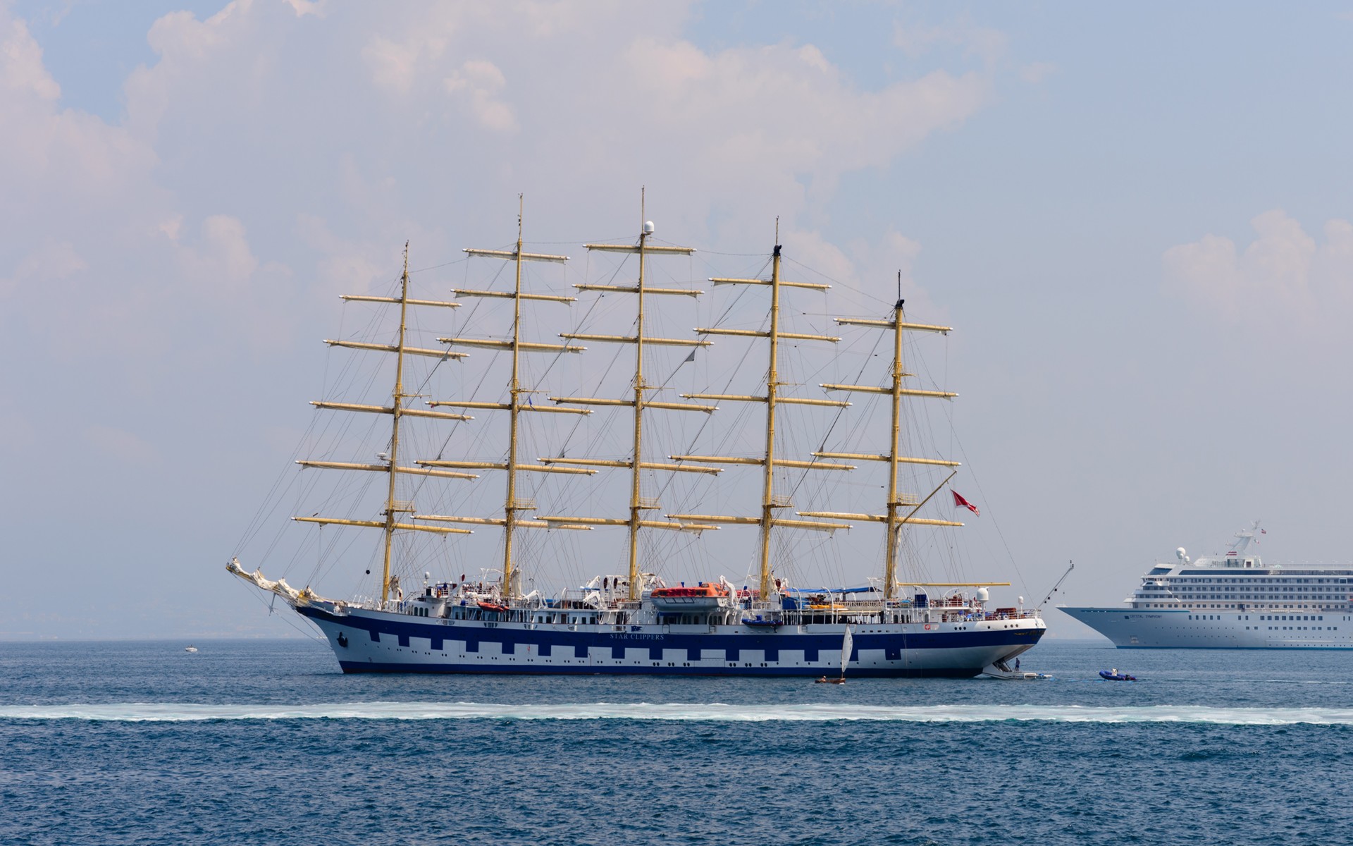 Description: A large boat sailing in the ocean next to a smaller boat in the water with a smaller boat in the background.