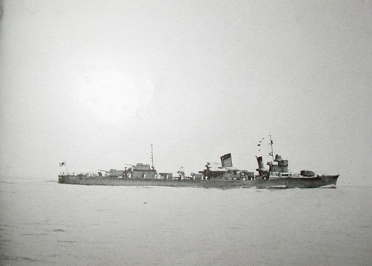 Description: A large boat floating on top of a body of water next to a shore line with a sky background.