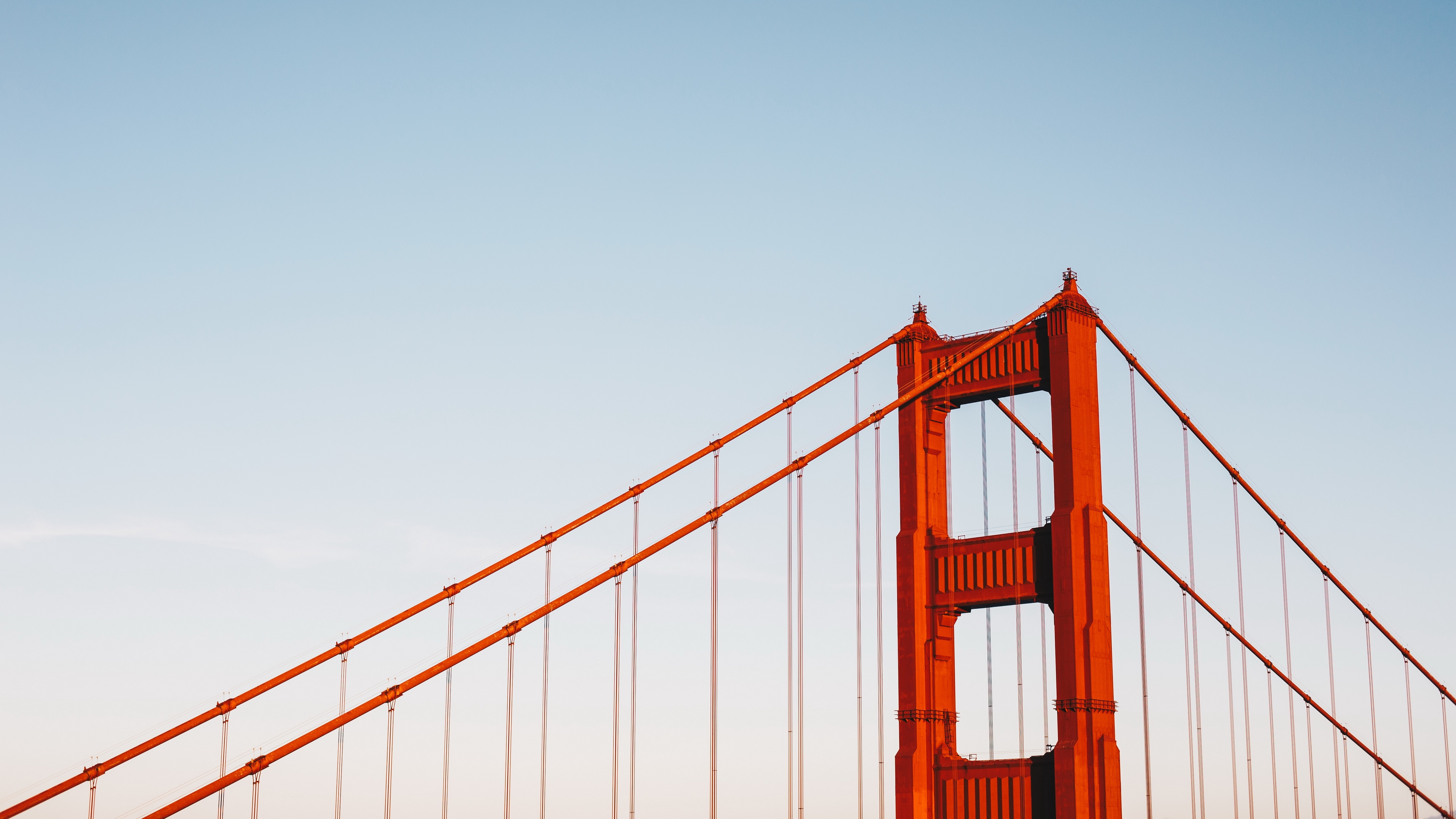 Description: A large bridge with a plane flying over it's top and a blue sky in the background with a few clouds.