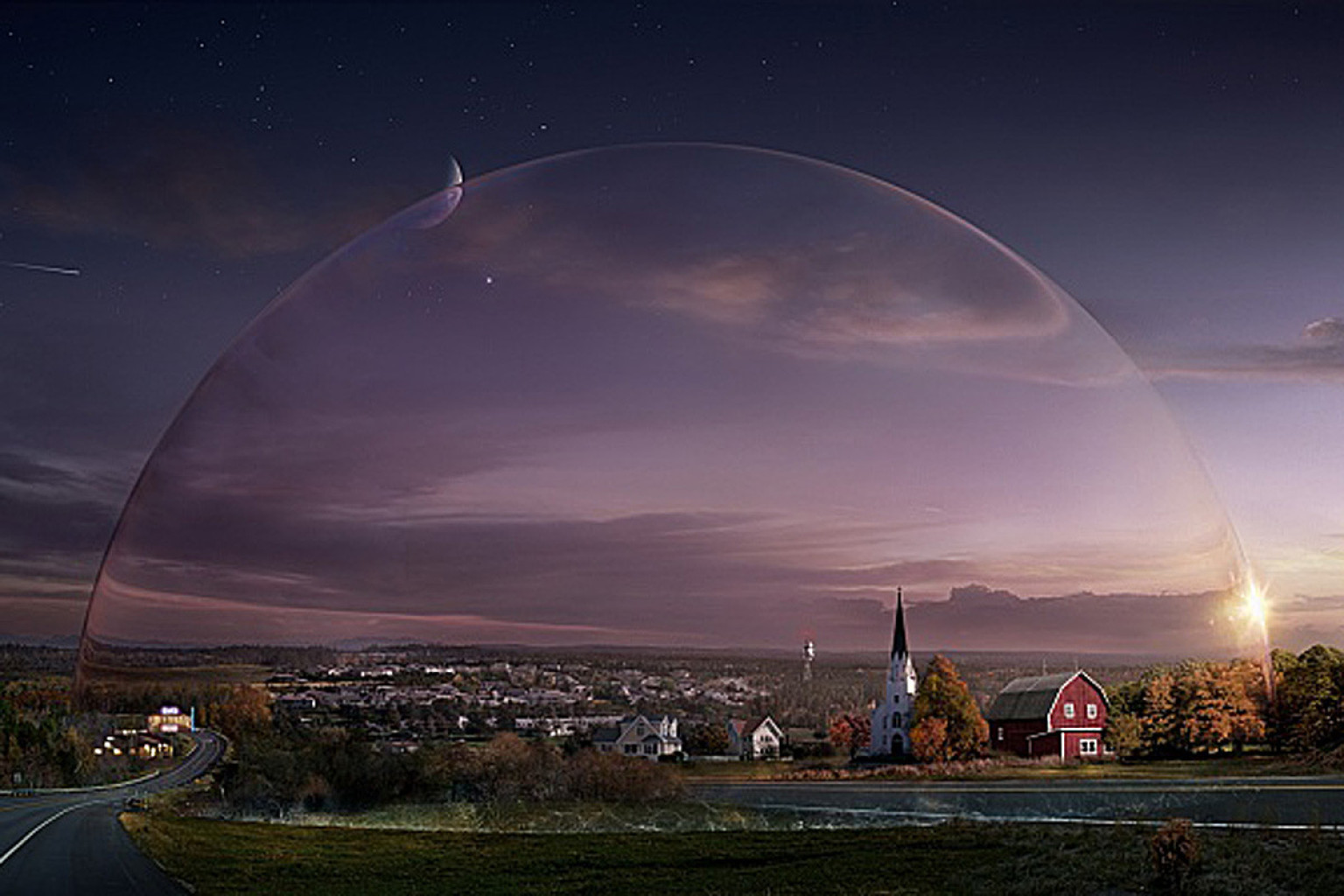 Description: A large bubble is in the middle of a road with a town in the background and a church in the distance.