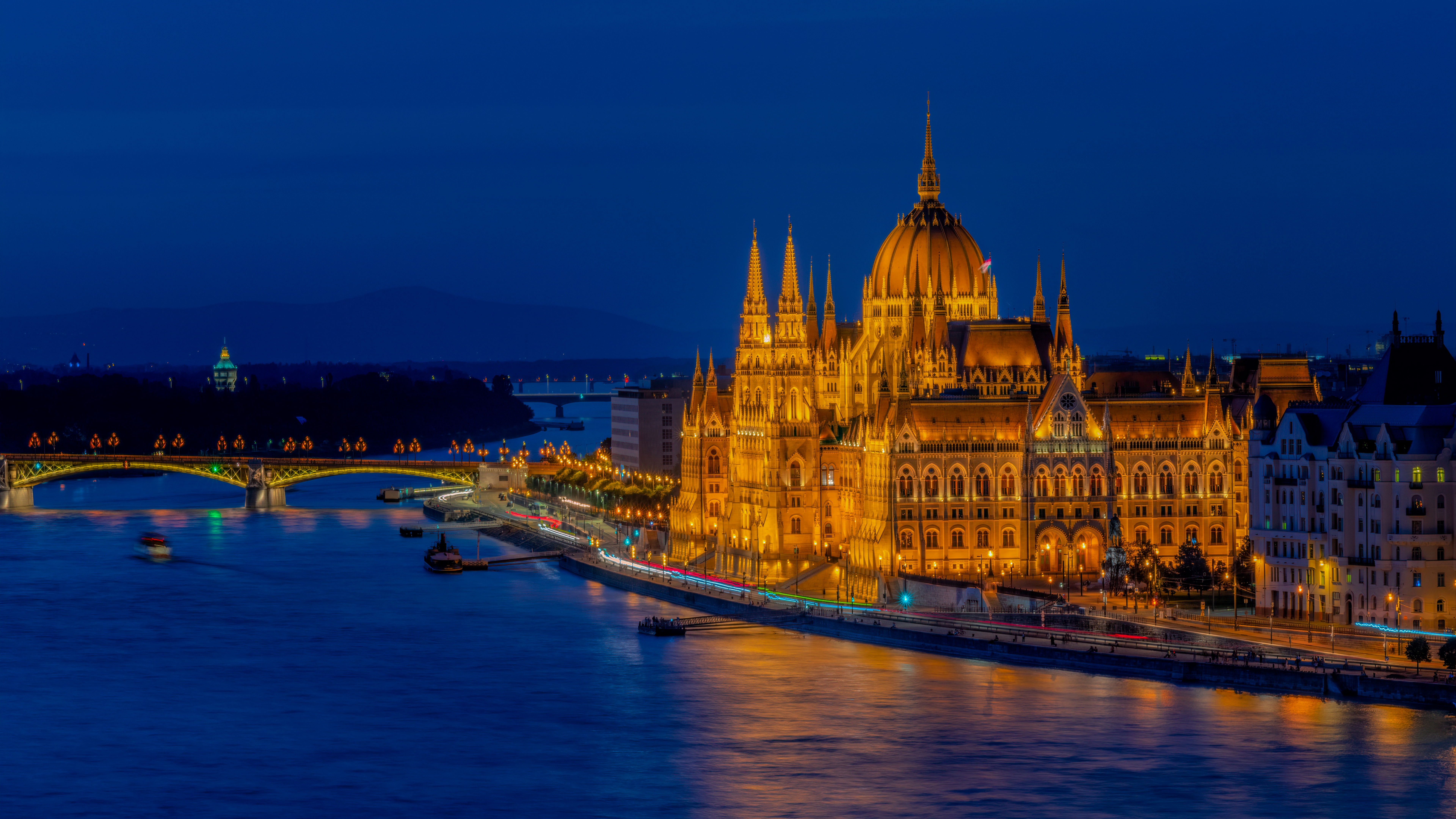 Description: A large building with a bridge over it and a boat in the water below it at night time with a bridge in the background.
