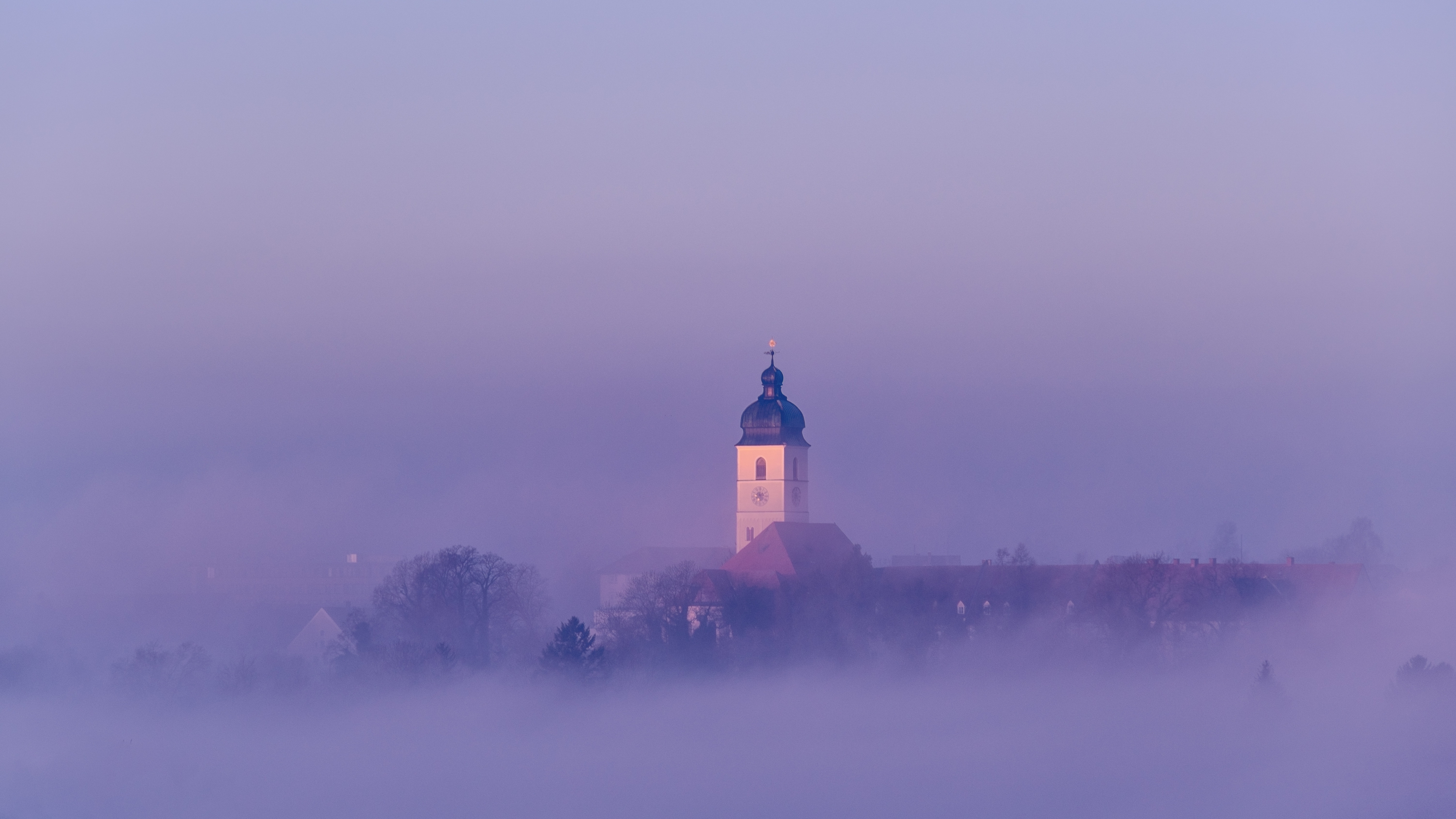 Description: A large building with a clock tower in the middle of a foggy field with trees in the background.