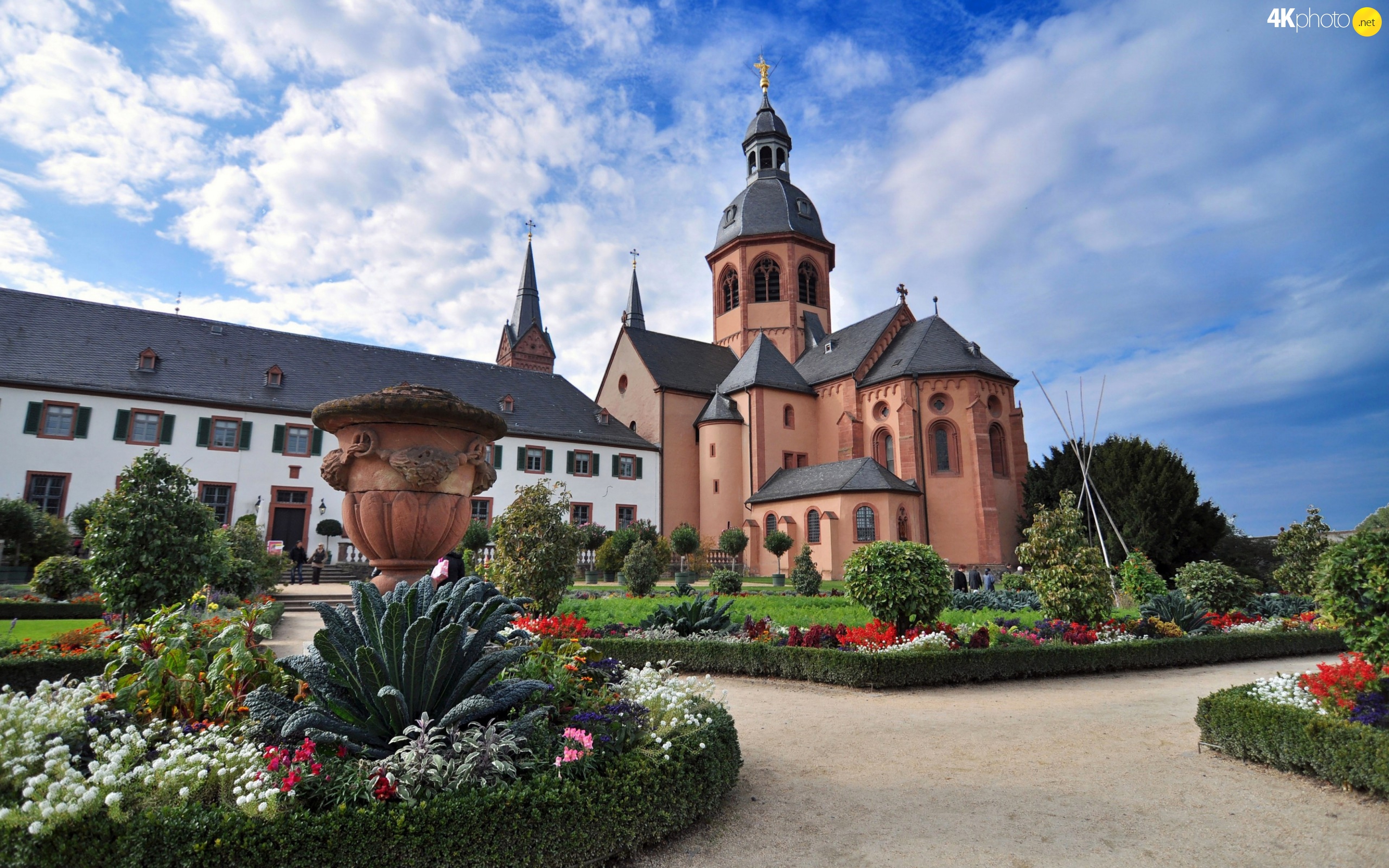 Description: A large building with a clock tower and a garden in front of it with a walkway leading to it.