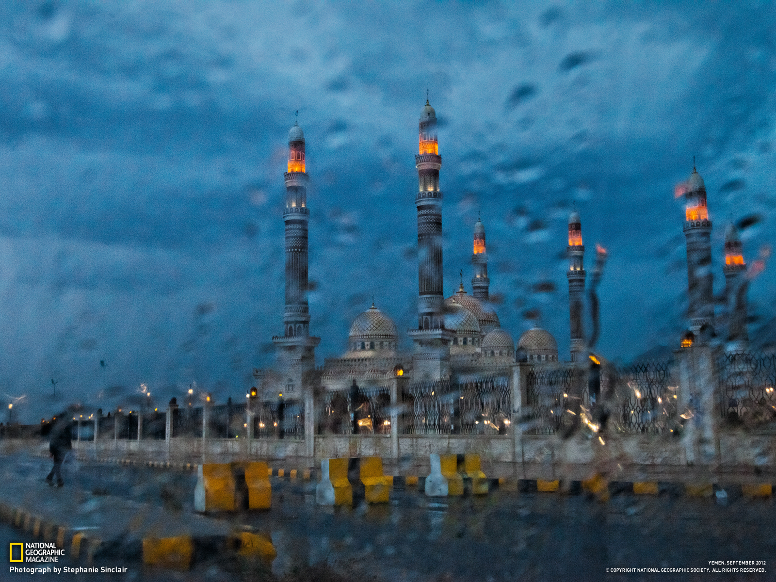 Description: A large building with a clock tower in the middle of it at night time with a person walking by.