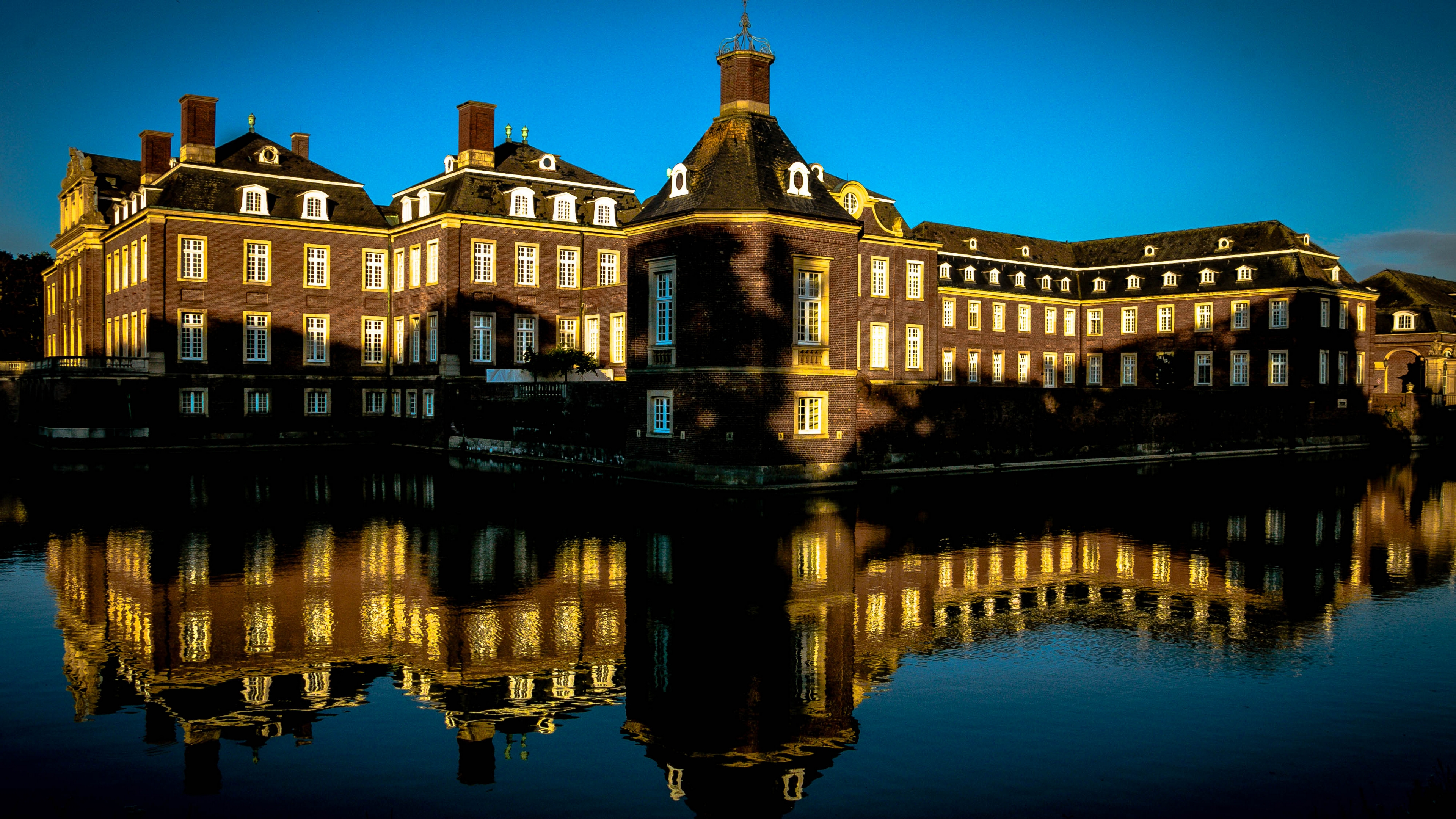 Description: A large building with a clock tower next to a body of water at night time with a reflection of the building on the water.