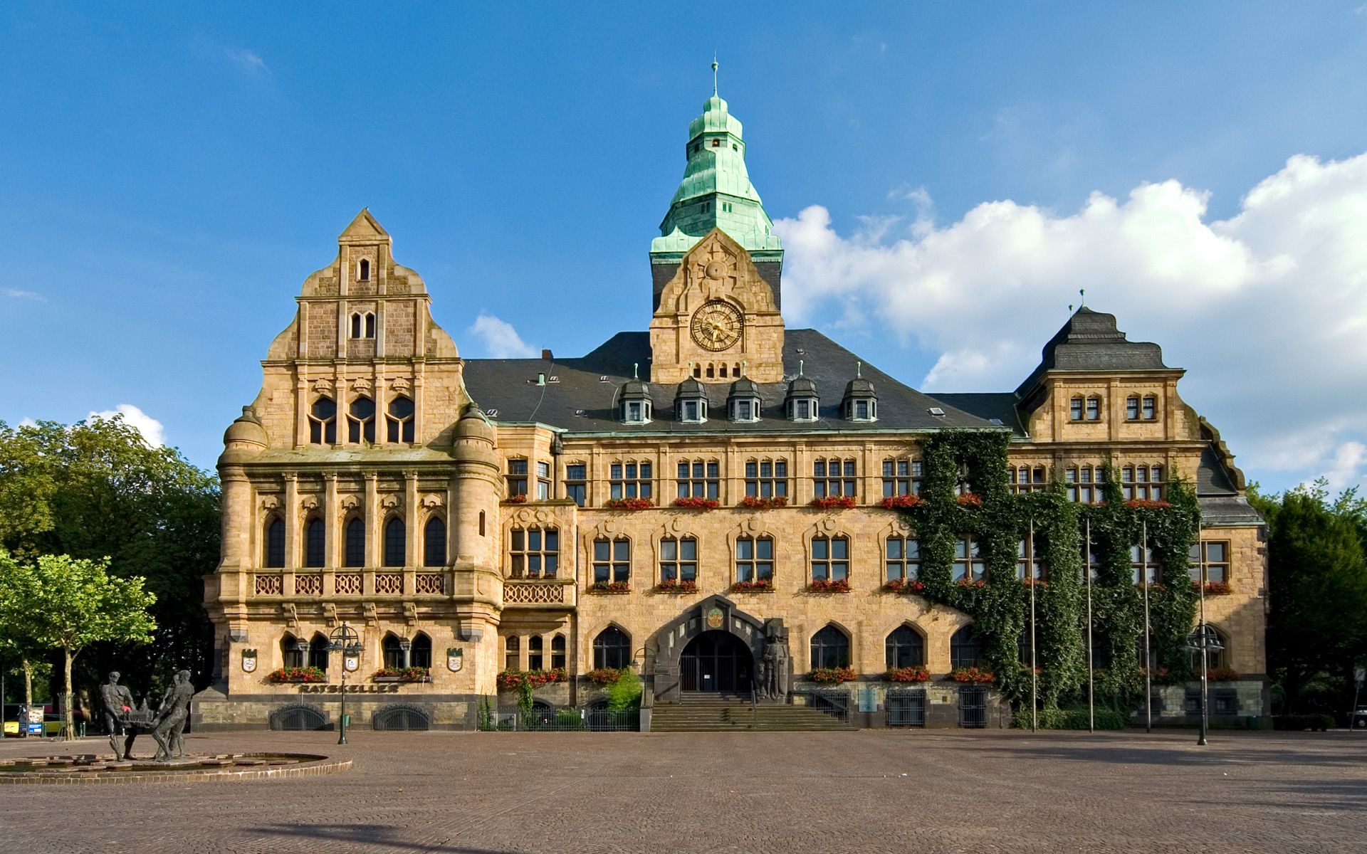 Description: A large building with a clock tower on top of it's side and a sky background with clouds.