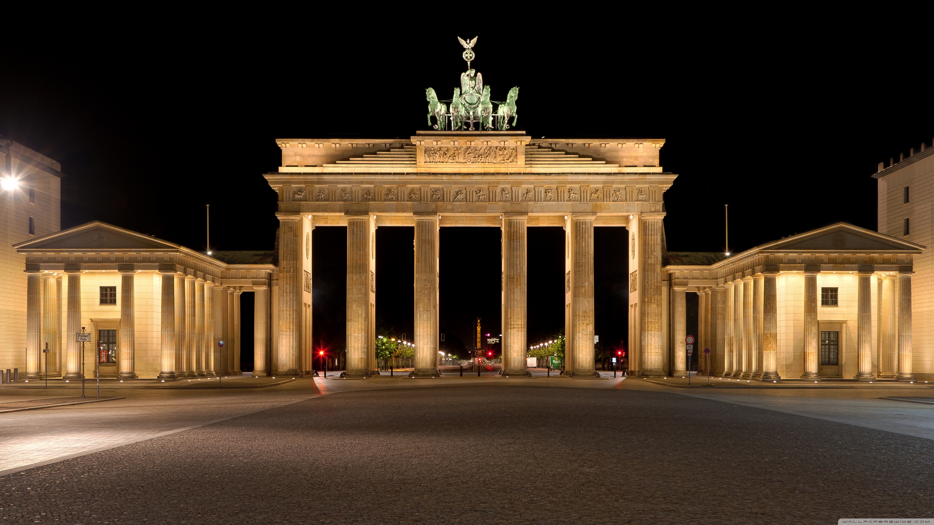 Description: A large building with columns and a statue on top of it at night time with lights on the top of the building.