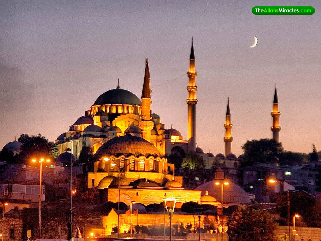 Description: A large building with a crescent on top of it at night with lights on it and a crescent in the sky.