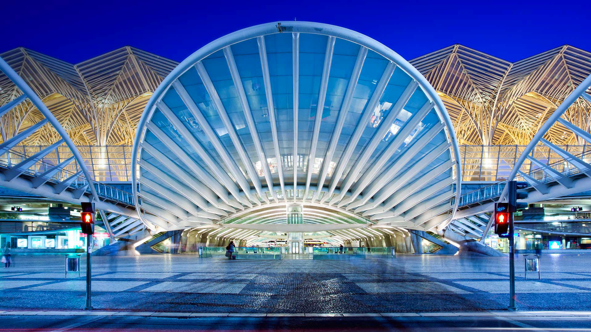 Description: A large building with a very long curved roof and a red traffic light in front of it at night.