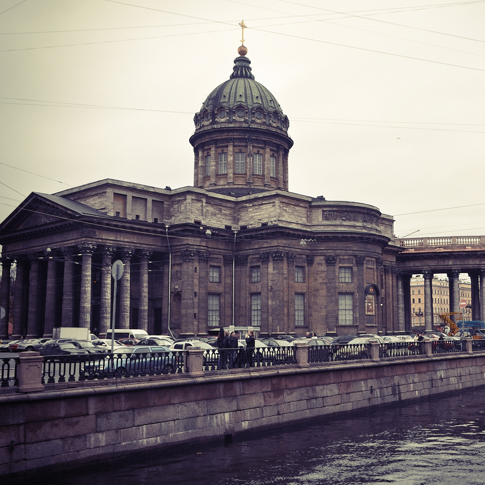 Description: A large building with a dome on top of it next to a river and a bridge with cars parked on it.