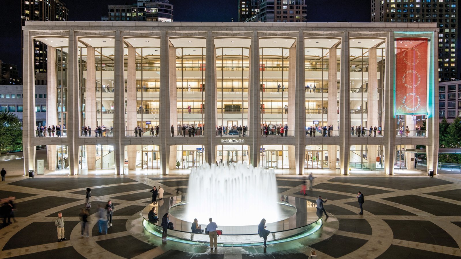 Description: A large building with a fountain in front of it at night time with people walking around it and a lot of windows.