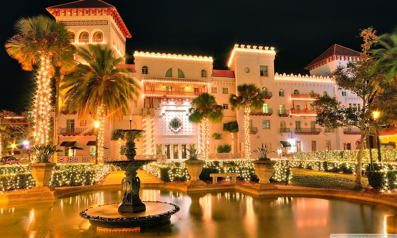Description: A large building with a fountain in front of it at night time with lights on the buildings and trees.