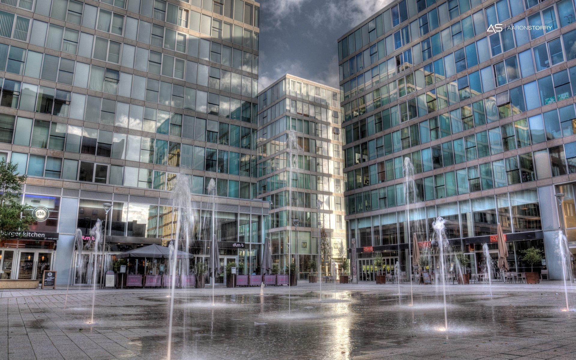 Description: A large building with a fountain in front of it and a lot of windows on the side of it.
